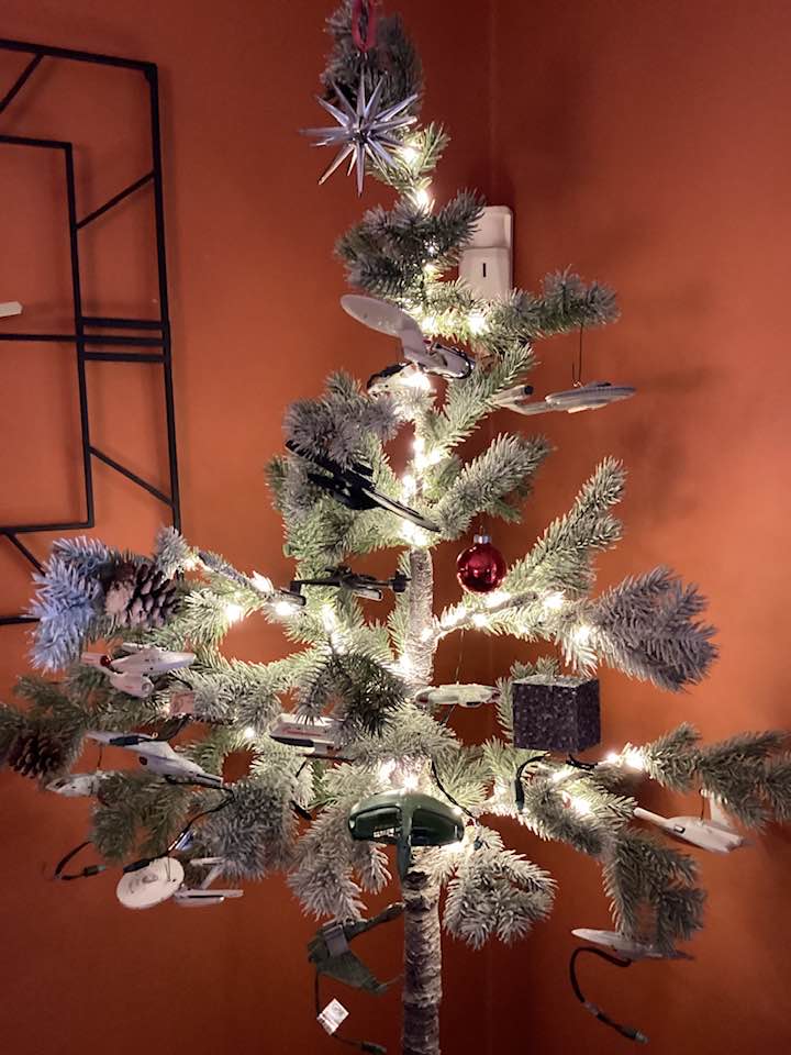 …neither of us wanted to wake up without a tree on Christmas, so I got to work re-imagining Star Trek: The Christmas Tree as a tabletop edition. This year’s tree is highly edited, sticking to mostly non-magic character ornaments and new and/or newish ships. Only a handful of batteries in this iteration. –Our Cattywampus Cottage