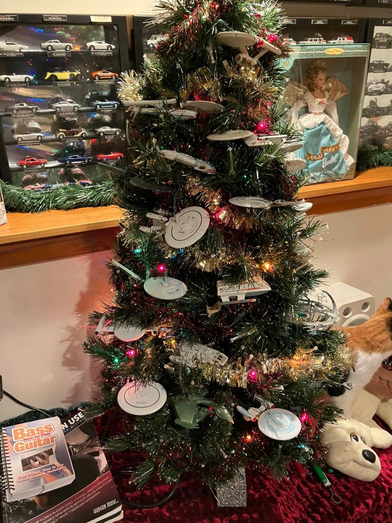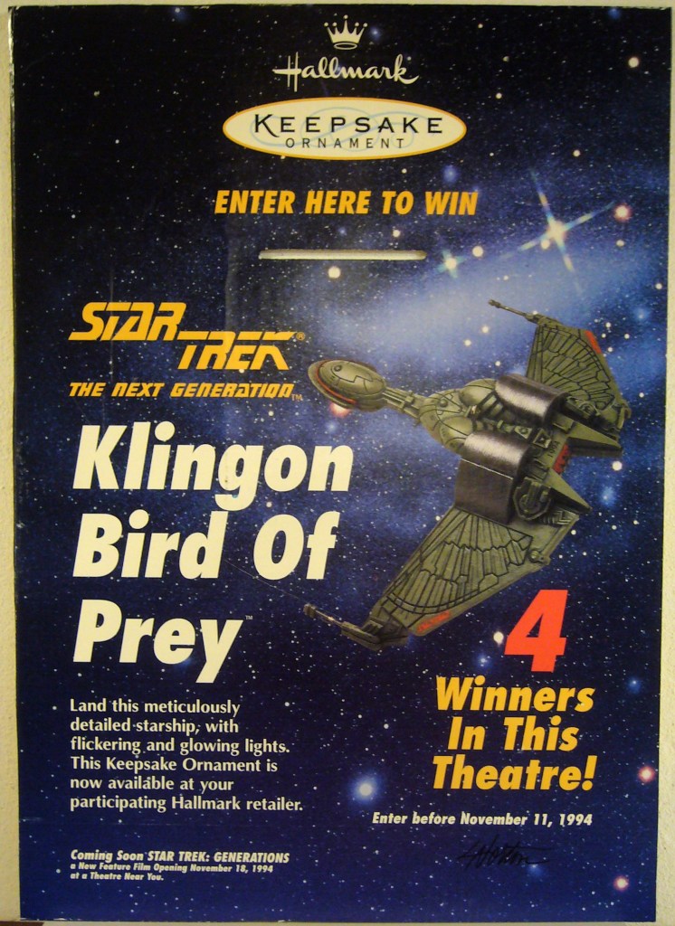 Norton: I’m pleased to hear that you know about Hallmark ornaments that appeared in STAR TREK series episodes. I had speculated about this until documentation appeared in a written article on page 674 of the STAR TREK: DEEP SPACE NINE COMPANION book. Kevin Dilmore helped us determine which ornaments were used in Voyager episodes (Voyager and Klingon Bird of Prey ornaments). We think the other Klingon ship on the mobile was a Johnny Lightening toy but no one at Paramount could verify. Your opinion is welcome.
