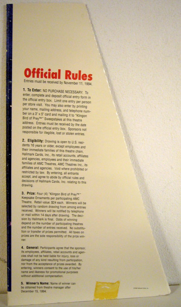 I don’t have any examples of entry forms but suspect they may have been similar to forms used in Hallmark retail stores. The large photograph of a KBOP ornament is of my hand-painted original prototype (as were all images printed on retail boxes, catalogs and promotional materials). The collection-box photograph reveals paint chipping on both disruptor-cannon barrels. I fabricated the barrels with formed/soldered brass wire and painted them with water-based paint, which wasn’t durable enough for repeated handling.
