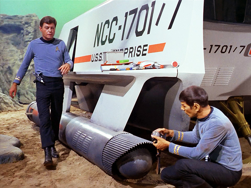 And check this one out! A 3-D scene inspired by the infamous 1968 AMT “Mr. Spock” model kit. It recreates Spock in his rocky alien diorama, phaser in hand, facing off against the three headed creature.