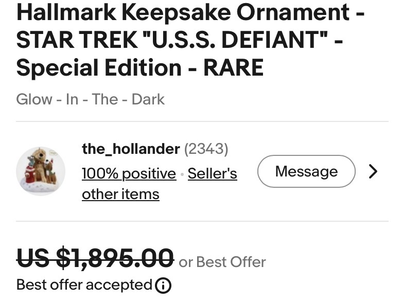 A 50th Anniversary Maxine Star Trek Ornament sold yesterday for only $518.52. The last two Maxine ornaments sold on eBay went for over $2,000.