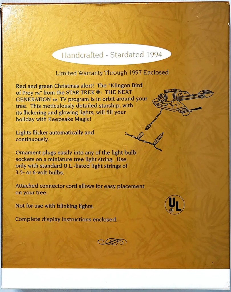 The 1994 Klingon Bird of Prey Hallmark ornament is modeled after the imposing Klingon space vessels from the hit television series: STAR TREK: THE NEXT GENERATION. With this fierce battleship orbiting around your tree, you had better notify Starfleet Command to send help immediately, just in case the Klingon commander has something up his sleeve. This meticulously detailed Klingon starship features automatically and continuously flickering and glowing lights from the front torpedo launcher and the rear engines.