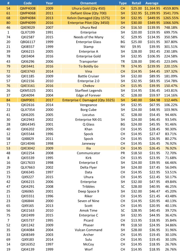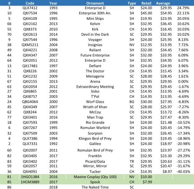 Ornaments highlighted in gold are convention exclusives. Those highlighted in light gold are Limited Editions. Ornaments in green are not Keepsake Ornaments but Hallmark branded ornaments.