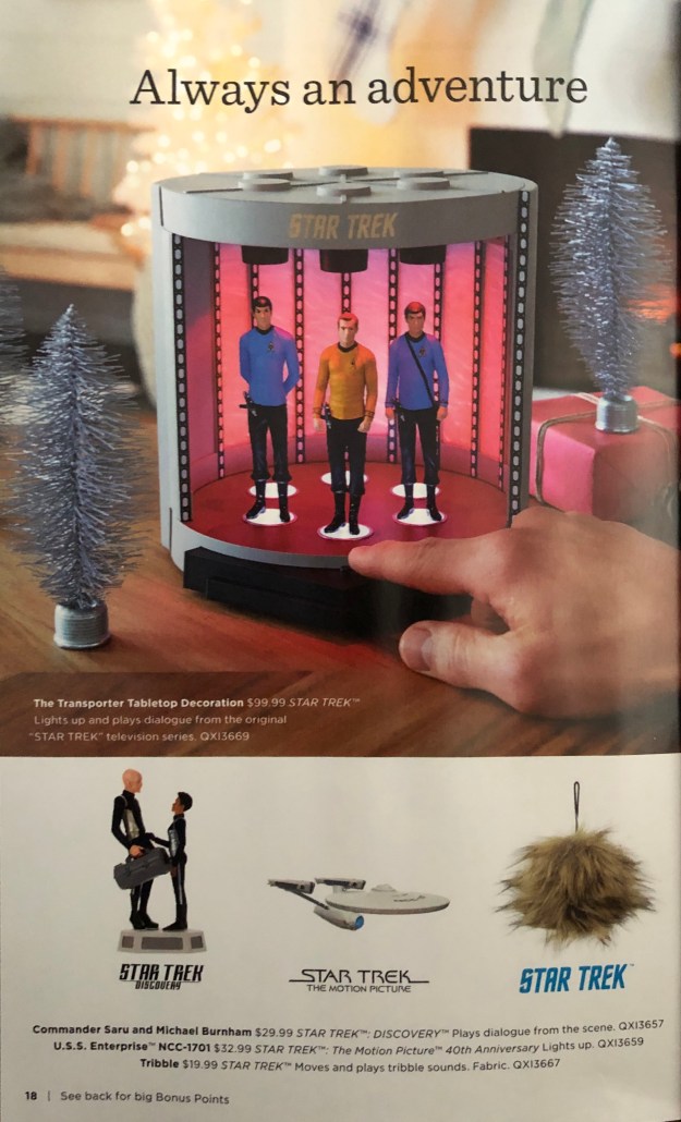 This year’s Keepsake Ornament Debut Event catalog which promotes the fall releases that will hit stores on October 5, 2019. The Transporter Table Decoration ($99.99) is highlighted along with the already released 2019 Star Trek ornaments.