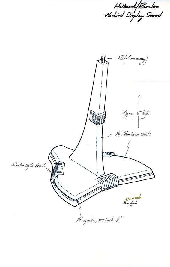 This is an 11″x17″ concept sketch of a proposed Hallmark ornament stand for the Romulan Warbird, with classic Romulan styling. This one-of-a-kind prop was designed by Star Trek Voyager Senior Illustrator Rick Sternbach. Drawing is signed in the lower right.