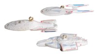 This set of three miniature Hallmark ornaments feature smaller versions of previoulsy released Hallmark keepsake ornaments – The Starship Enterprise from the original tv series, U.S.S. Enterprise 1701-D, and the Klingon Bird of Prey from Star Trek: The Next Generation. These miniature ornaments can hang independently, or be hung from the 2001 Space Station Deep Space Nine Hallmark ornament. When combined with the 2001 Starfleet Legends, you can create your own miniature Star Trek fleet.