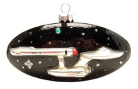 Box text: The flagship of Starfleet, U.S.S. Enterprise NCC-1701 embarked on its historic five-year mission under Captain James T. Kirk in 2265. The ship and crew introduced Star Trek™ viewers to the final frontier with unparalleled adventure, life on new worlds and unimaginable technologies. An homage to the classic series and its legacy of more than 50 years, this premium Christmas tree ornament is rendered in metal, an essential addition to any Star Trek™ collection.