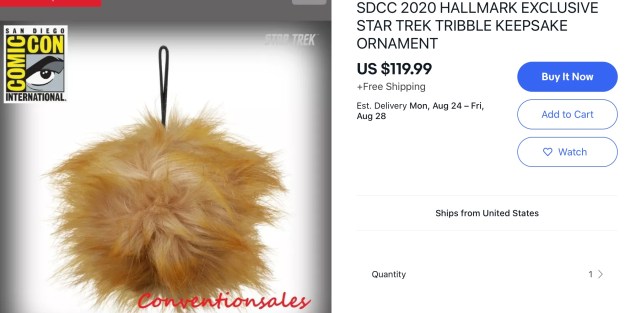 Preorders for this year’s convention exclusive Tribble are beginning to show up on eBay. Hallmark has yet to announce how the Tribble will be made available since most of the conventions have been cancelled/postponed due to COVID-19. Convention exclusive ornaments have always been available for preorder in year’s past from convention goers. The current price of $119.99 is on the high side of the typical $80-$120 the exclusives typically fetch this early in the game. The Tribble will be made available originally at $20.