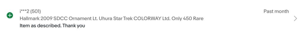 HSTO: ”That has certainly crossed my mind and it would be pretty easy to alter the red version of Uhura (and the glow in the dark Defiant) and then print a box. I began posting the ornament listings by seller for this very reason.”