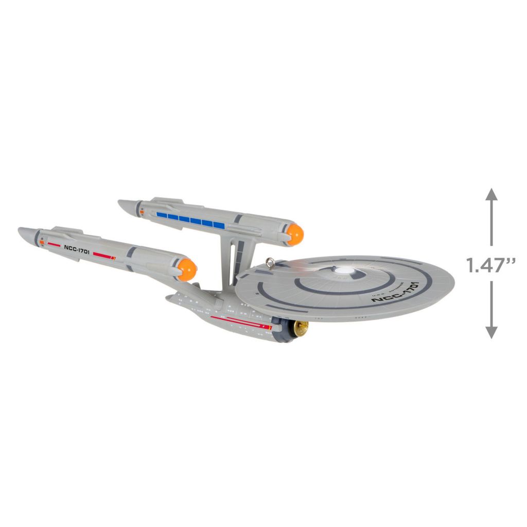 Before the arrival of James T. Kirk, the flagship of Starfleet was commanded by Captain Christopher Pike with a devotion to the values of the United Federation of Planets. Boasting a design that was introduced in “Star Trek: Discovery” and later appeared in “Star Trek: Strange New Worlds,” this U.S.S. Enterprise Christmas tree ornament lights up at the touch of a button (battery-operated).
