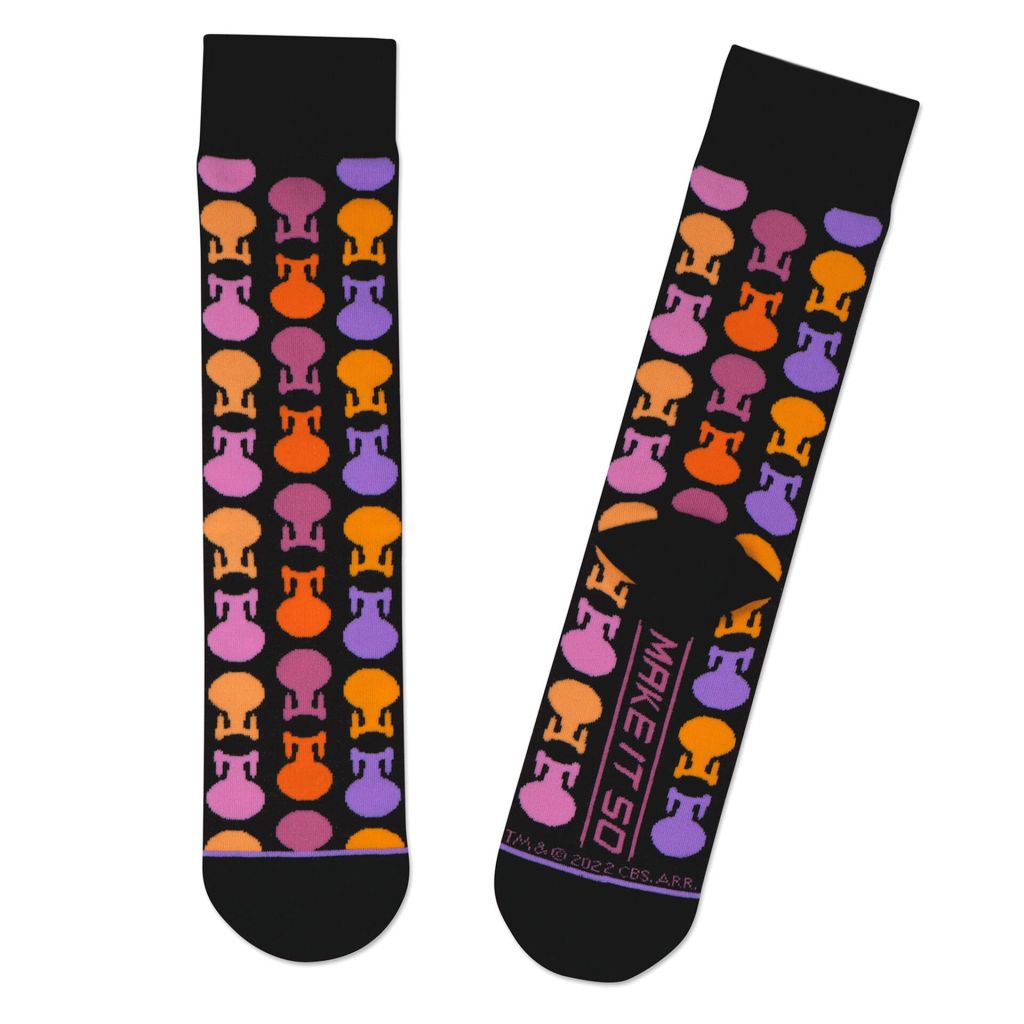 Voyage across the planet in style when you boldly wear this pair of Star Trek crew socks. The black socks feature colorful silhouette designs of the U.S.S. Enterprise and Captain Jean-Luc Picard’s iconic phrase, “Make it so.” The fashion-forward footwear makes a great gift for fans of the popular sci-fi TV series.