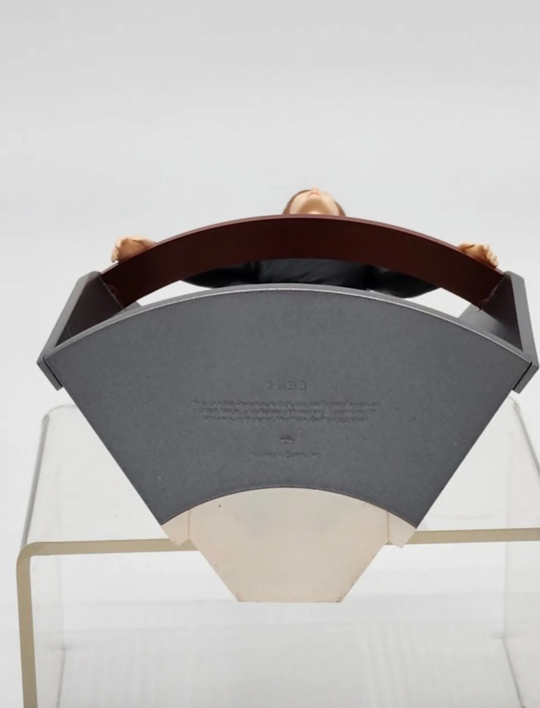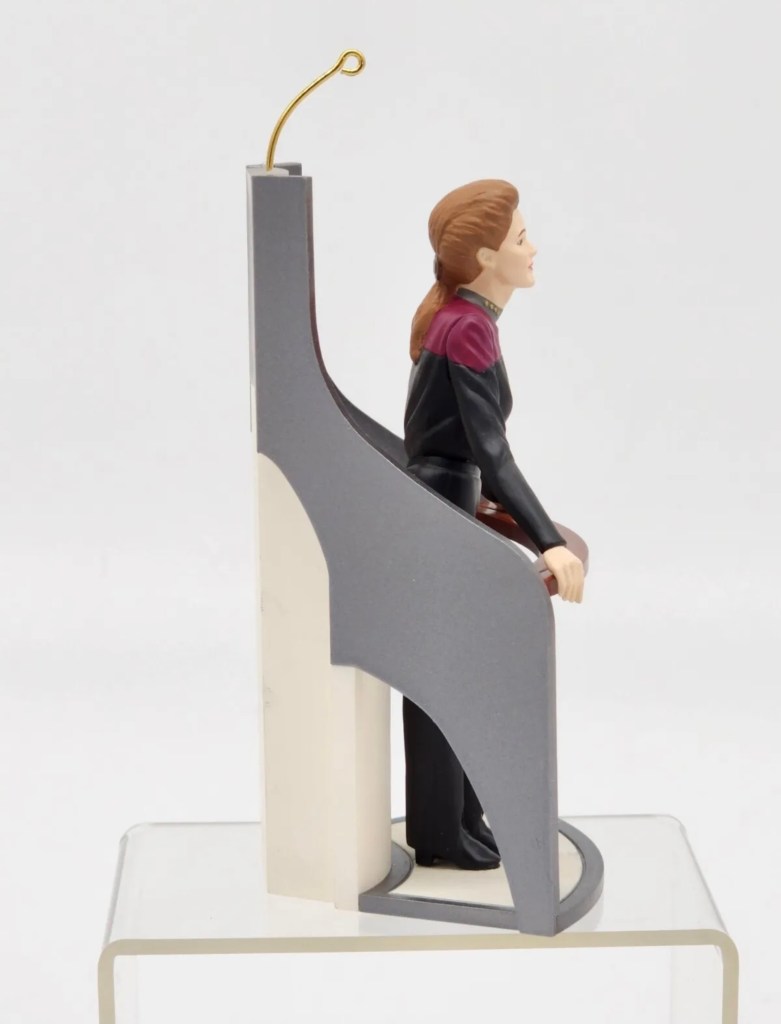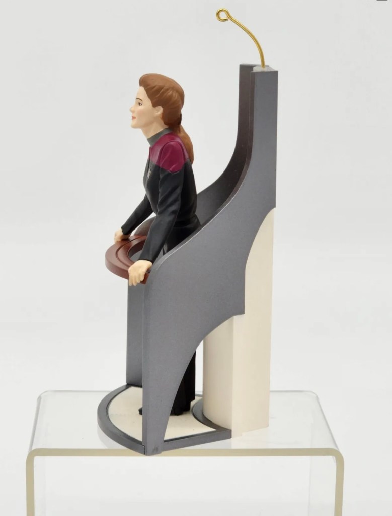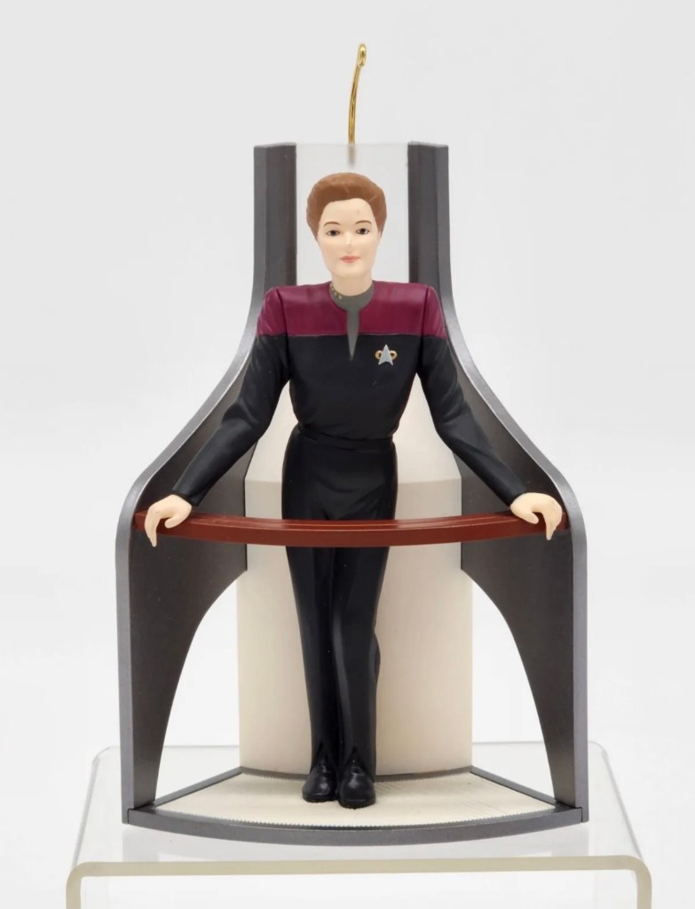 Captain Kathryn Janeway (played by actress Kate Mulgrew) is featured in the 1998 Star Trek Hallmark ornament. Captain Janeway is in command of the Federation Starship U.S.S. Voyager, and is hurled into an exciting and terrifying adventure in the Delta Quadrant, along with the rest of her crew and some Marquis that she picked up along the way. As she and the crew of voyager strive to find a way back to Earth, they encounter a wide variety of different species and obstacles, but none more treacherous than the Borg. With technology that Captain Janeway sent herself from the future, she is able to defeat the vile Borg queen, and use one of the Borg conduits to get Voyager and her crew back to Earth. We later discover that Captain Janeway is promoted to Admiral, most likely for her heroic deed by destroying the biggest enemy that the Federation had ever faced, and under the most dire of situations.