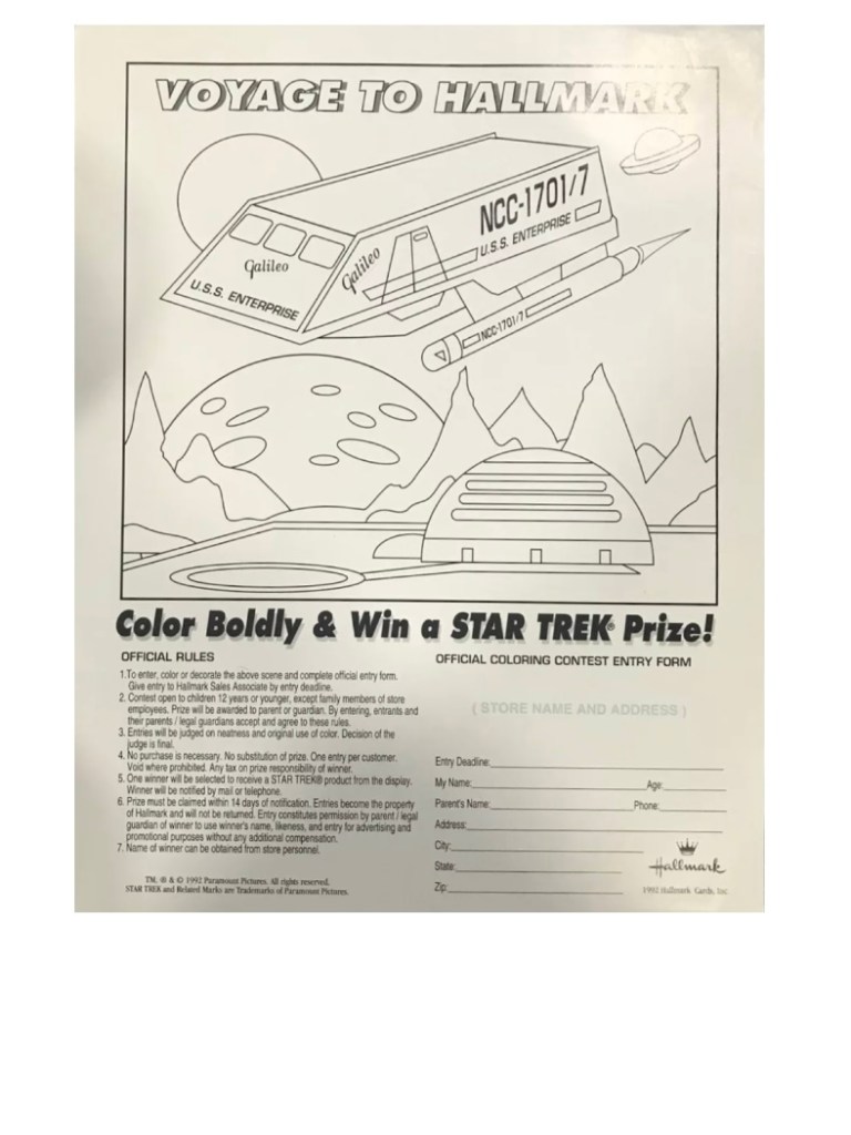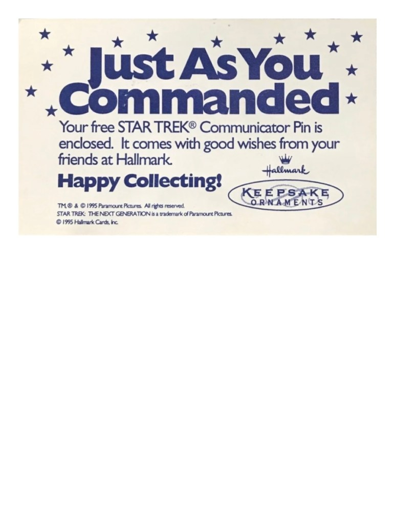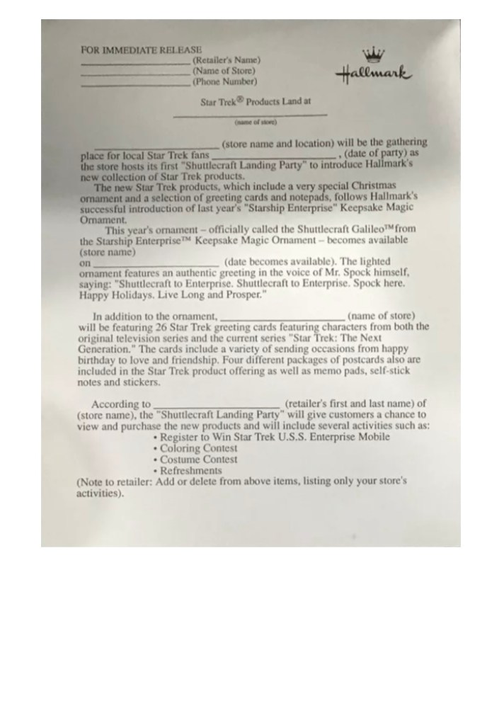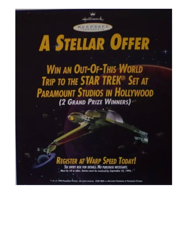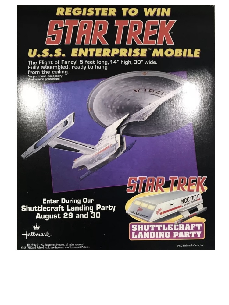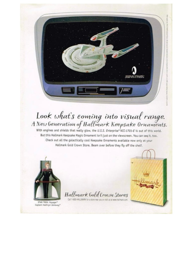 Hallmark Star Trek Advertising & Marketing Collectibles Leave a reply 1992 Galileo Merchandiser 1992 Promotion Kit Contents 1992 Contest Winner Guidelines 1992 News Release 1992 Bag Stuffer Slick 1992 Ad Slick 1992 Direct Mail Invitation Slick 1992 Full Color Direct Mail Invitation 1992 Landing Party Manager’s Guide 1992 Sales Associate’s Guide 1992 Button Insert 1992 Mobile Poster 1992 Entry Form Slick 1992 Enterprise Mobile Prize 1992 Costume Contest Display Card 8” x 10” 1992 Coloring Contest Sign 1992 Entry Form Slick 1992 Display Card 8” x 10” 1992 20 1/2” x 30” Poster 1992 Print Ad V.1 1992 Print Ad V.2 1993 Outpost 1993 Outpost 1993 Outpost 1993 Promotion Guide 1993 Promo Button 1993 Store Poster 1993 Store Poster 1993 Ad Slick 1993 Print Ad 1994 Outpost 1994 Outpost 1994 Store Poster 1994 Store Poster 1994 Store Poster 1994 Store Poster 1994 Promotional Flyer 1994 Print Ad 1995 Outpost 1995 Outpost 1995 Outpost 1995 Outpost 1995 8” x 21” Sign 1994 Coming Soon – Bird-of-Prey 1995 Coming Soon – Kirk 1995 Coming Soon – Picard 1995 Coming Soon 1995 Coming Soon 1995 Table Tent 1995 Pin Premium Badge 1995 Pin Premium 1995 Pin Premium 1995 Sneak Peek Puzzle 1996 Outpost 1996 Horizontal Outpost 1996 Outpost 7 3/4” x 9 7/8” 7 3/4” x 9 7/8” 1996 Coming Soon 1996 Coming Soon 1996 Coming Soon 1996 Pin Entry Form Display 1996 Pin Promo Badge 1996 “As You Commanded” 1996 Promo Pin 1996 Print Ad 1997 Outpost 1997 Outpost 1997 Coming Soon – Data 1997 Coming Soon – Defiant 1997 Coming Soon – McCoy 1997 Defiant Hanger 1997 Reversible Store Poster Defiant/Barbie48” x 72” 1997 Print Ad 1998 Outpost 1998 Coming Soon – Janeway 1998 Coming Soon – Enterprise E 1998 Print Ad 1999 Outpost 2016 Convention Handout 2016 Convention Handout 2016 50th Anniversary Promo Button 2018 Print Ad Share this:ShareTweet Click to share on Reddit (Opens in new window) Reddit Like Loading... Related