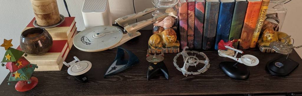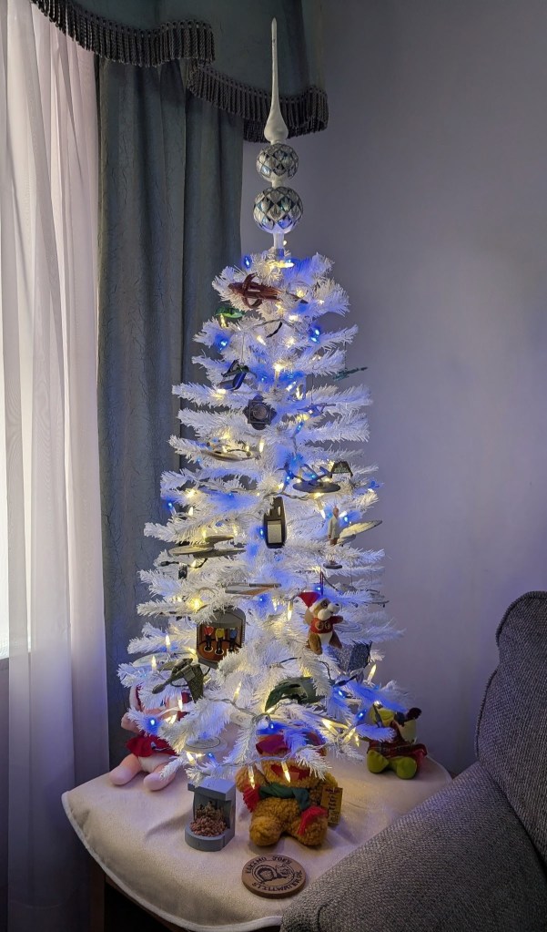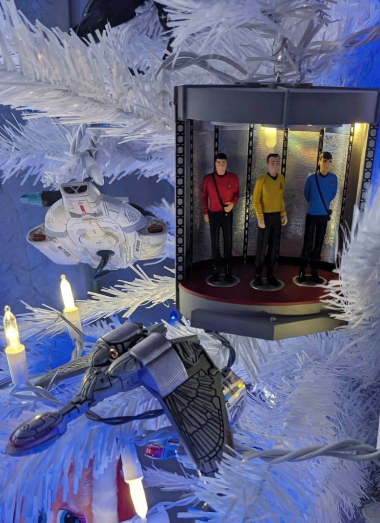 As a tribute to Michael, I have meticulously arranged all of his Hallmark Star Trek ornaments, accompanied by a lovely Waterford tree topper discovered at an antique store and Buc-ee from Denton, TX, during our Dallas trip for his birthday. I have also incorporated the Muppet Babies from McDonald’s, which I had given him as a Christmas gift in 1986 and the Rhode Island state quarter. Miss you Michael. –Nuada A. Flagon