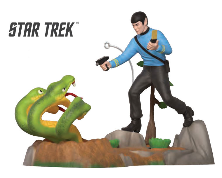And check this one out! A 3-D scene inspired by the infamous 1968 AMT “Mr. Spock” model kit. It recreates Spock in his rocky alien diorama, phaser in hand, facing off against the three headed creature.