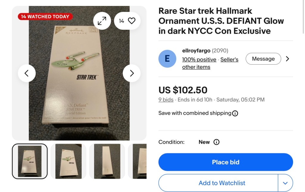 Third Defiant This Month Available Leave a reply eBay item number:147278148973 Rare Star trek Hallmark Ornament U.S.S. DEFIANT Glow in dark NYCC Con Exclusive. Condition is New. Shipped with USPS Ground Advantage. Share this:ShareTweet Share on Reddit (Opens in new window) Reddit Like Loading... Related