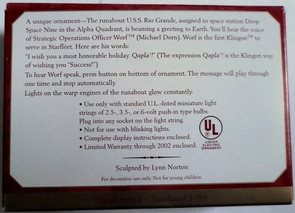 Box Text: A unique ornament – The runabout U.S.S. Rio Grande assigned to space station Deep Space Nine in the Alpha Quadrant, is beaming a greeting to Earth. You’ll hear the voice of Strategic Operations Officer Worf (Michael Dorn). Worf is the first Klingon to serve in Starfleet. Here are his words: “I wish you a most honorable holiday. Qapla’!” (The expression Qapla’! is the Klingon way of wishing you “Success!”) To hear Worf speak, press button on bottom of ornament. The message will play through one time and stop automatically.