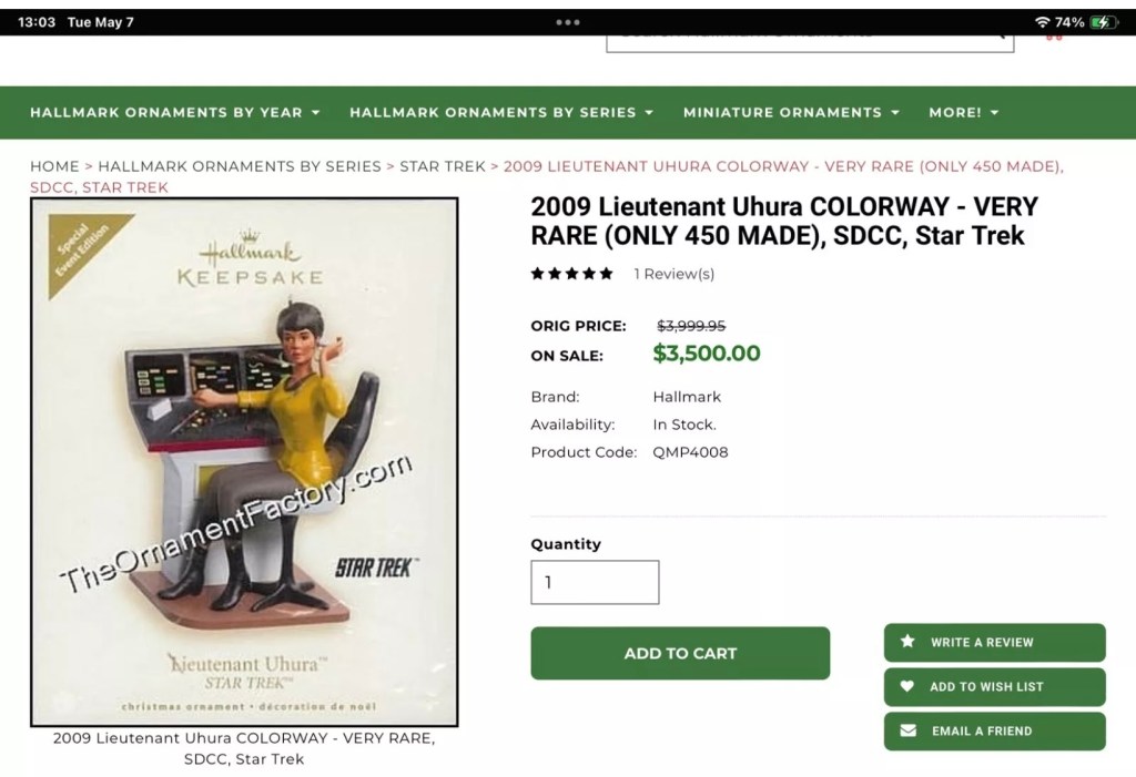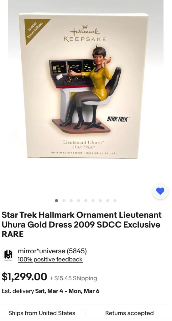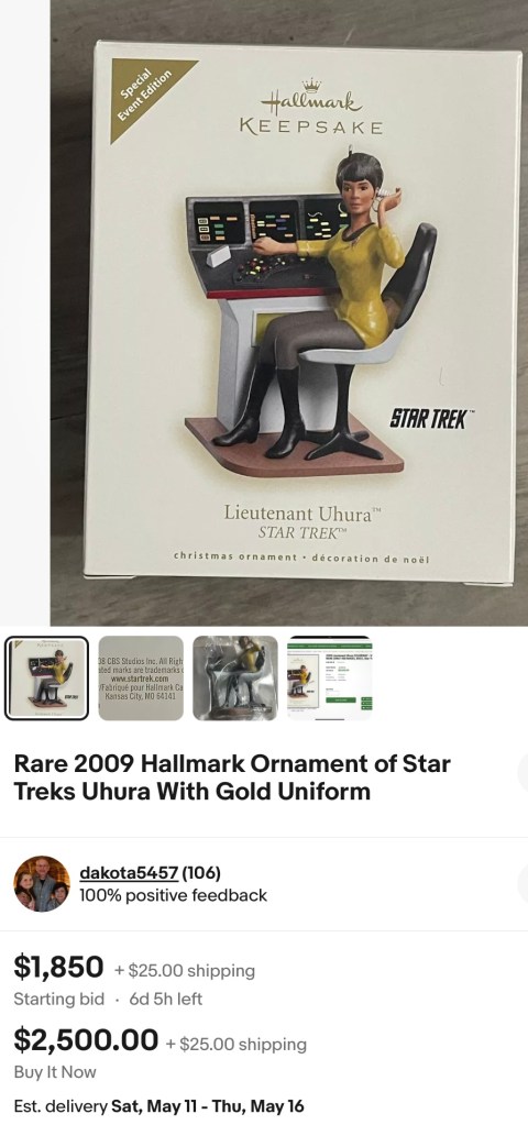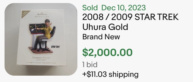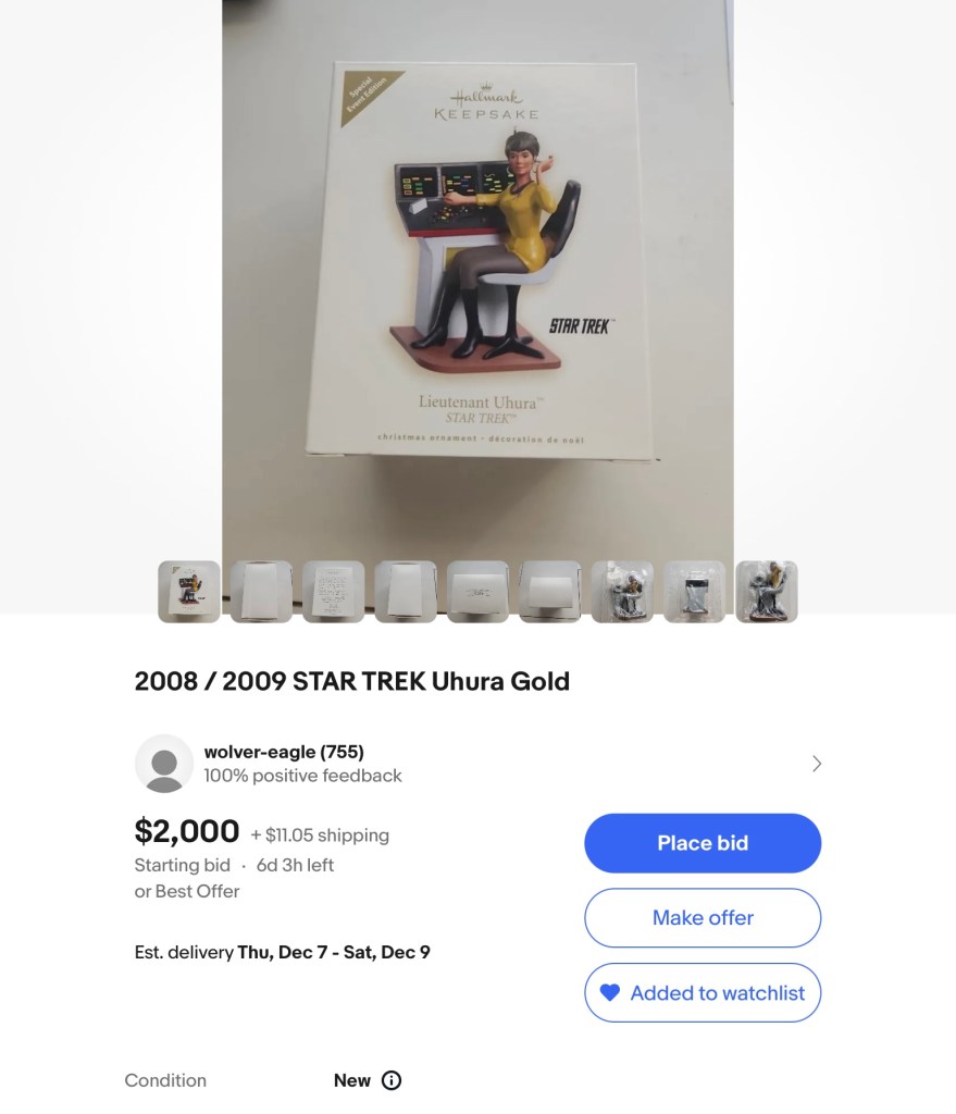 Just days after a 2009 Uhura Gold ornament sold on eBay for just under $1,000, a second Uhura Gold has been posted. This ornament has requiring a starting bid of $1,875 (with shipping).
