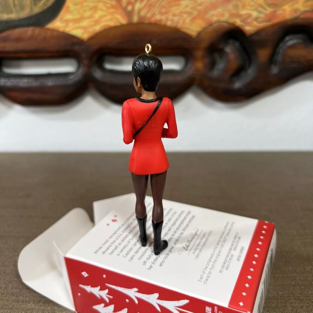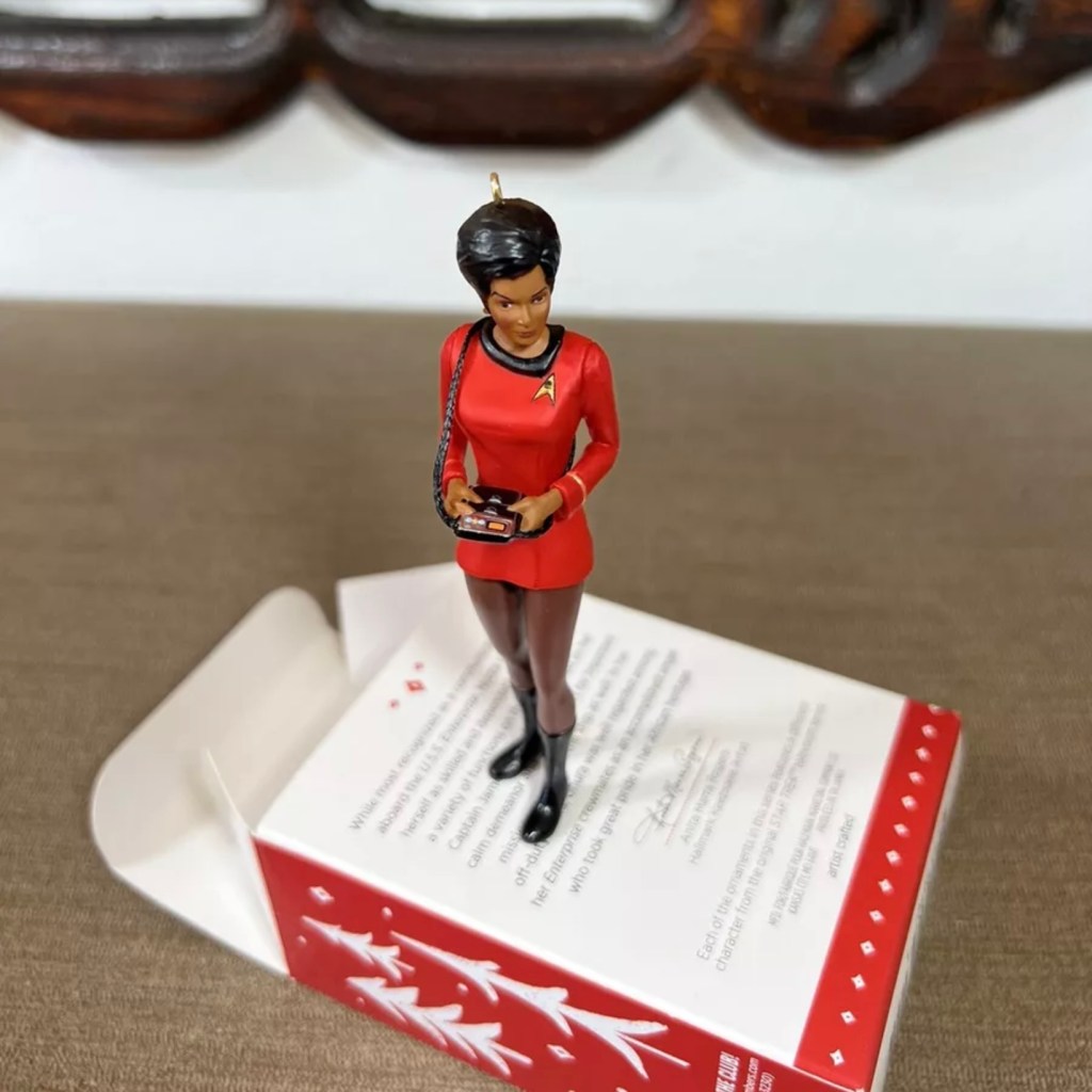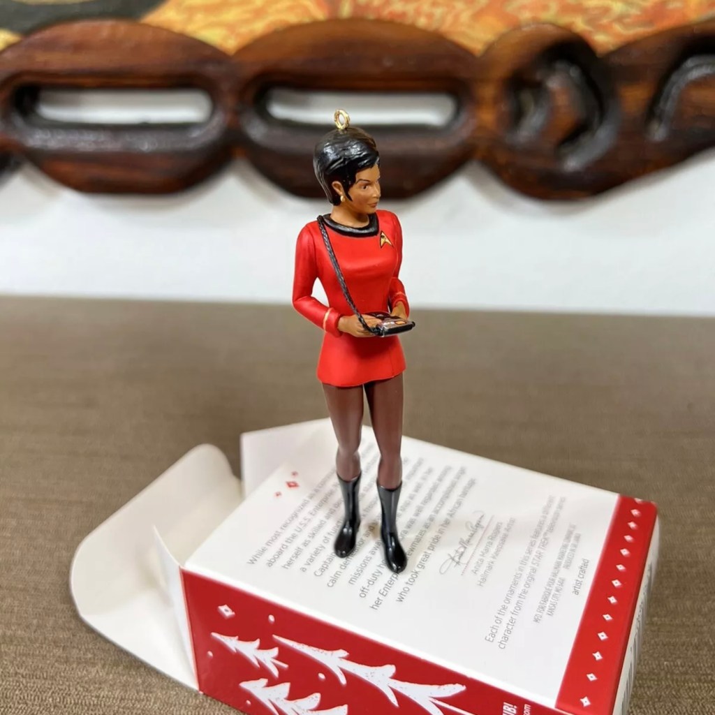 Uhura in her iconic pose, left hand up to her ear and elbow pointed out, was recreated in Keepsake form in 2007.Left: Uhura in “The Carbonite Maneuver”. Right: The 2009 convention exclusive ornament is a simple repaint of the 2007 Uhura in red, happily, she strikes her famous pose wearing gold in the “The Carbonite Maneuver” (S:1, E:10). The back of the Hallmark box states Uhura had only wore gold in that one episode although she had donned it previously in “Mudd’s Women” (S:1,E:6).Left: Nichelle Nichols as Uhura in a 1966 publicity still. Right: 2015 Legends Series: Uhura ornament with slightly less hair and missing the front overlap on her skirt.Left: Uhura in “Mirror, Mirror” (S:2, E:4). Right: 2020 Storytellers Series: Uhura ornament.