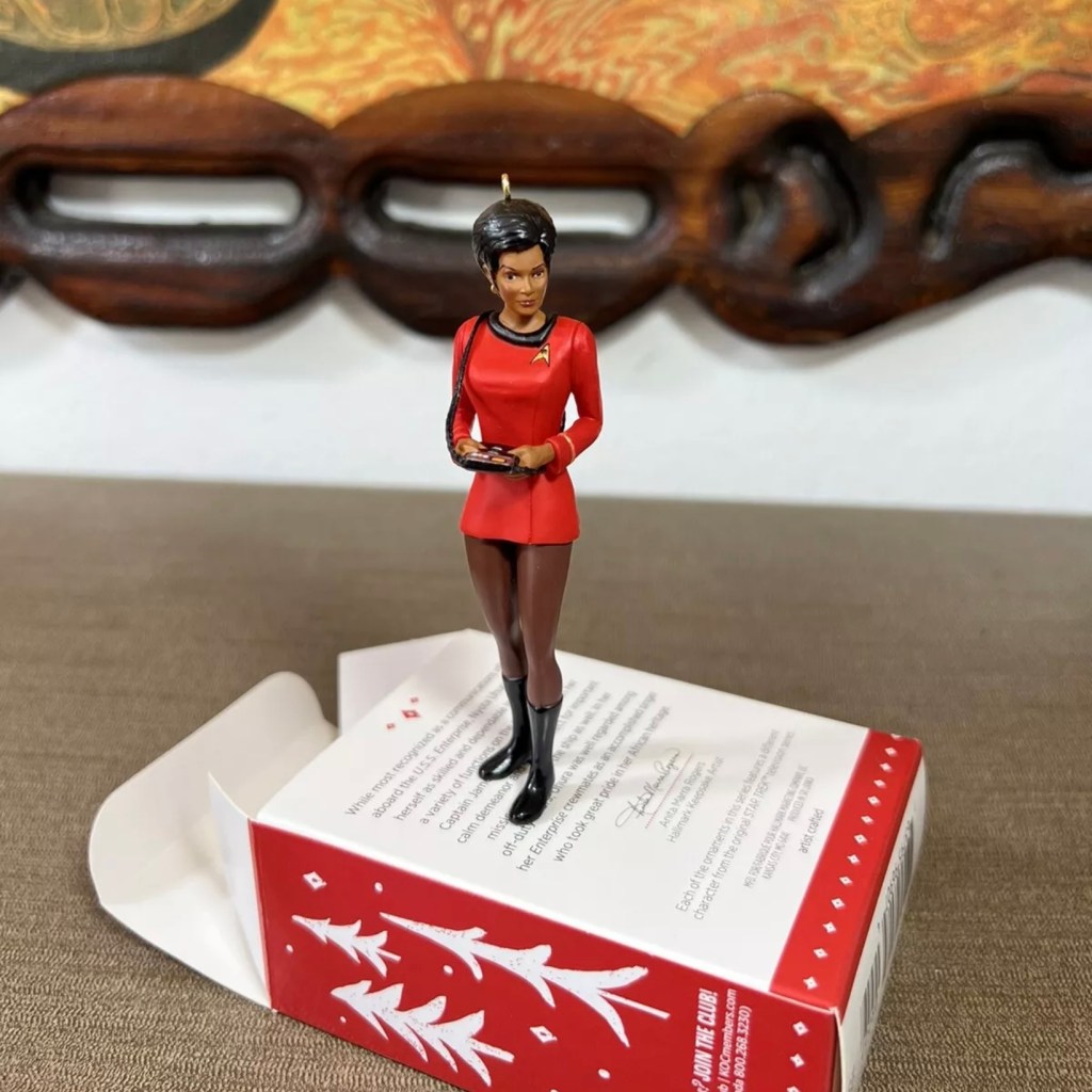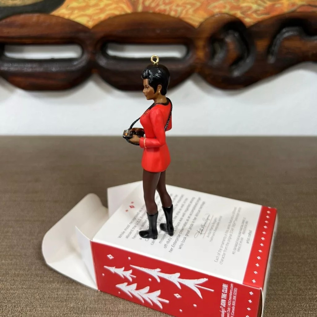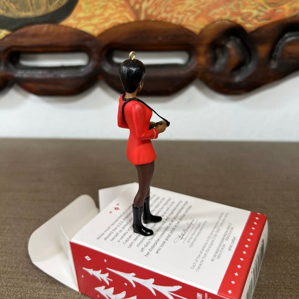 Uhura in her iconic pose, left hand up to her ear and elbow pointed out, was recreated in Keepsake form in 2007.Left: Uhura in “The Carbonite Maneuver”. Right: The 2009 convention exclusive ornament is a simple repaint of the 2007 Uhura in red, happily, she strikes her famous pose wearing gold in the “The Carbonite Maneuver” (S:1, E:10). The back of the Hallmark box states Uhura had only wore gold in that one episode although she had donned it previously in “Mudd’s Women” (S:1,E:6).Left: Nichelle Nichols as Uhura in a 1966 publicity still. Right: 2015 Legends Series: Uhura ornament with slightly less hair and missing the front overlap on her skirt.Left: Uhura in “Mirror, Mirror” (S:2, E:4). Right: 2020 Storytellers Series: Uhura ornament.