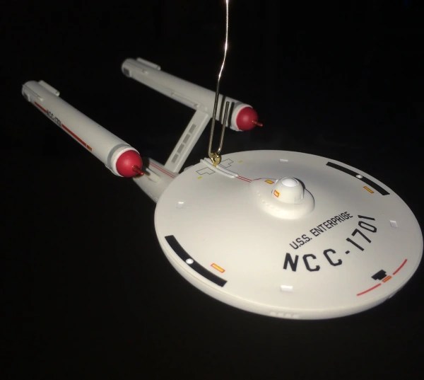 #6 on our list is a repaint of the 2016 50th anniversary Hallmark store ornament. The Keepsake available in stores was an all gold version of the early Enterprise while the Event Edition, which was released the same year, was a screen accurate painted version. Both ornaments played Kirk’s opening monologue and the Star Trek theme song.