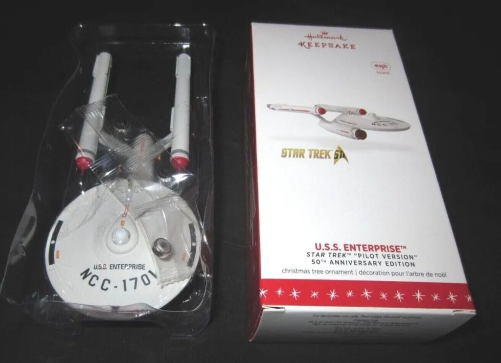Above: 2016 Enterprise Event Exclusive painted Star Trek pilot ornament. Below: 11’ Enterprise model pictured on December 29, 1964.