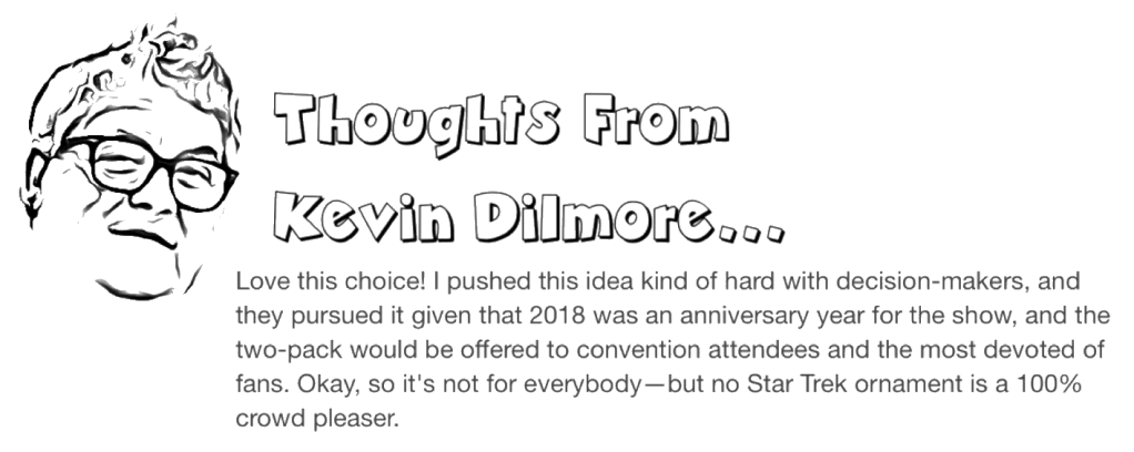Kudos to Hallmark for giving fans these lesser known peripheral Star Trek characters the ornament treatment. Star Trek: The Animated Series will celebrate its 50th anniversary in 2023 and it is doubtful we will see another ST: TAS ornament. But if Hallmark needs an idea, an old television console with the animated series playing on it would be welcomed. We wouldn’t even need a new sculpt, they could do a repaint of the 2009 Twilight Zone ornament or maybe even the 2020 Kanine Krunchies Keepsake…dogs like Trek too.