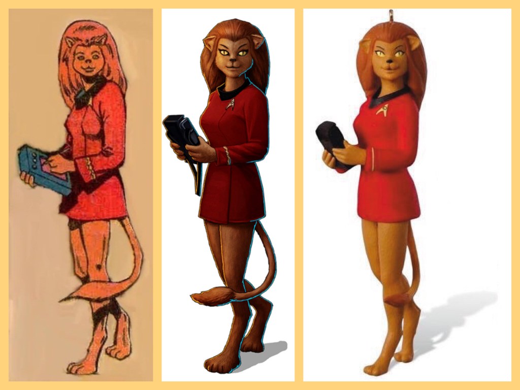 Left: Illustration from Who’s Who in Star Trek by Ken Penders & Romeo Tanghal, Source: Memory Beta Middle: Source: Star Trek Timelines Wiki Right: 2018 Hallmark M’Ress ornament.Illiustration from Who’s Who In Star Trek Issue #1.Page from Who’s Who In Star Trek Issue #1, 1987, DC Comics Image from They Boldly Went