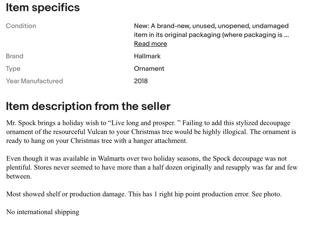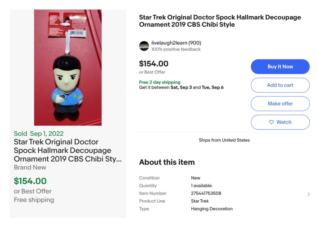 Many consumers didn’t know they were getting a rare ornament when they stumbled across them on Amazon. They have no idea the Picard ornament can fetch a high price on eBay. Prices will range wildly depending on the knowledge of the seller. It has been sold as a “buy it now” for less than $20 and it has been listed as “rare” and sold for over $130.
