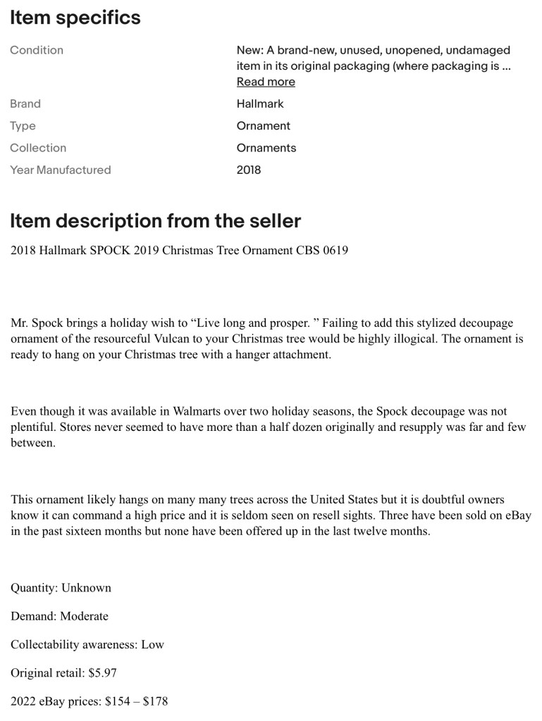 If you are a Star Trek ornament completist there are six ornaments which will prove the most elusive. Some were produced in small quantities for conventions which immediately made them collectibles. Some were more widely available but are rarely seen up for resell because owners likely do not know they have something of value. Both quantity and collectability awareness contribute to an ornament’s availability and price in the secondhand market.