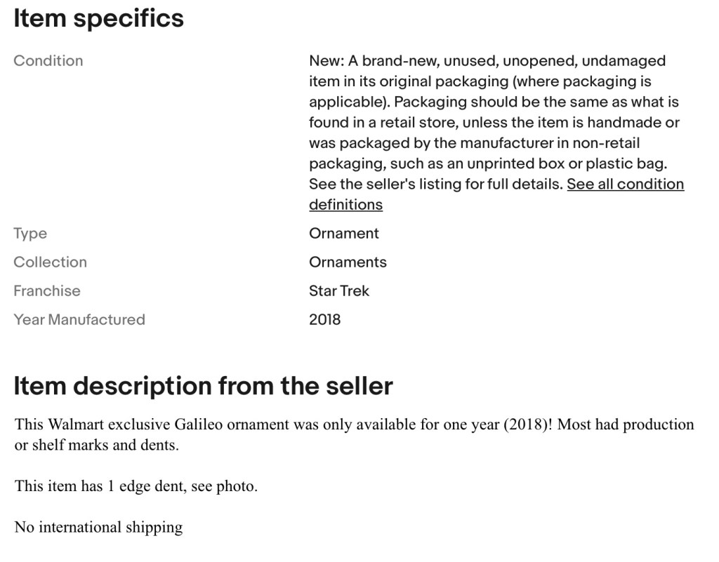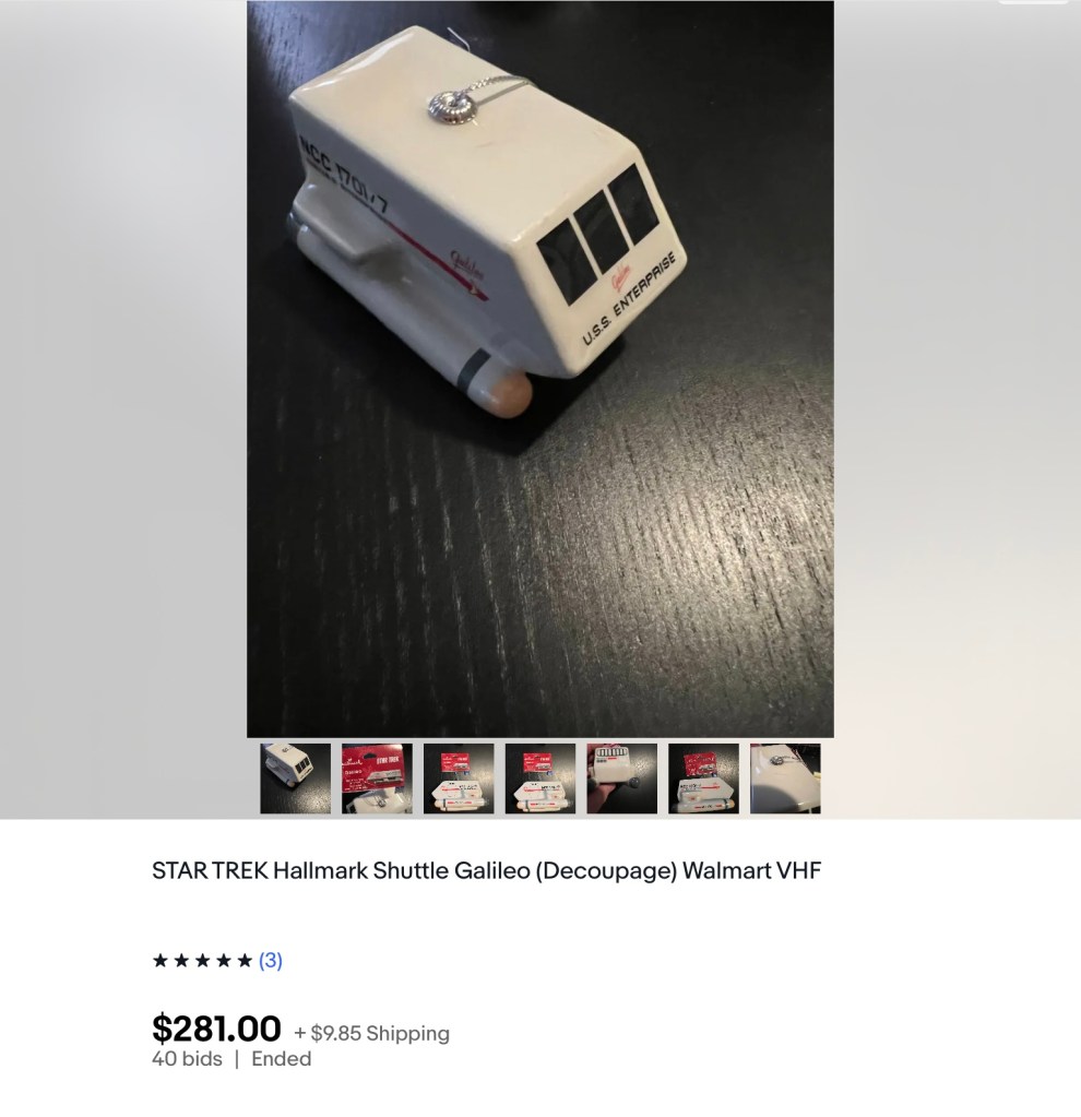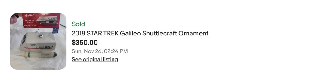 A 2018 Shuttlecraft Galileo Decoupage has sold on eBay for $290.85 after shipping. The ornament was originally sold at Walmart for less than $10.00.