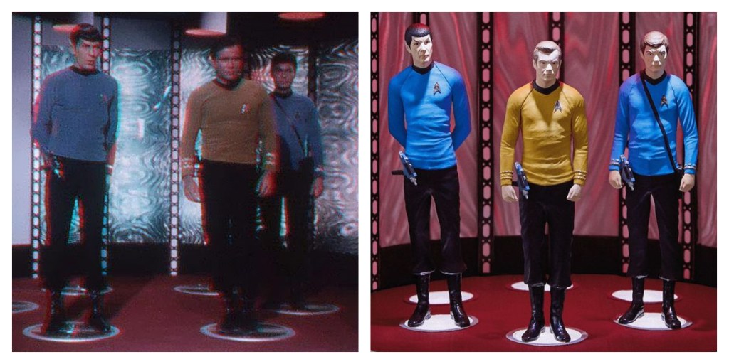 All three characters in the same pose, phasers on their sides and tricorder hanging from McCoy’s right shoulder.