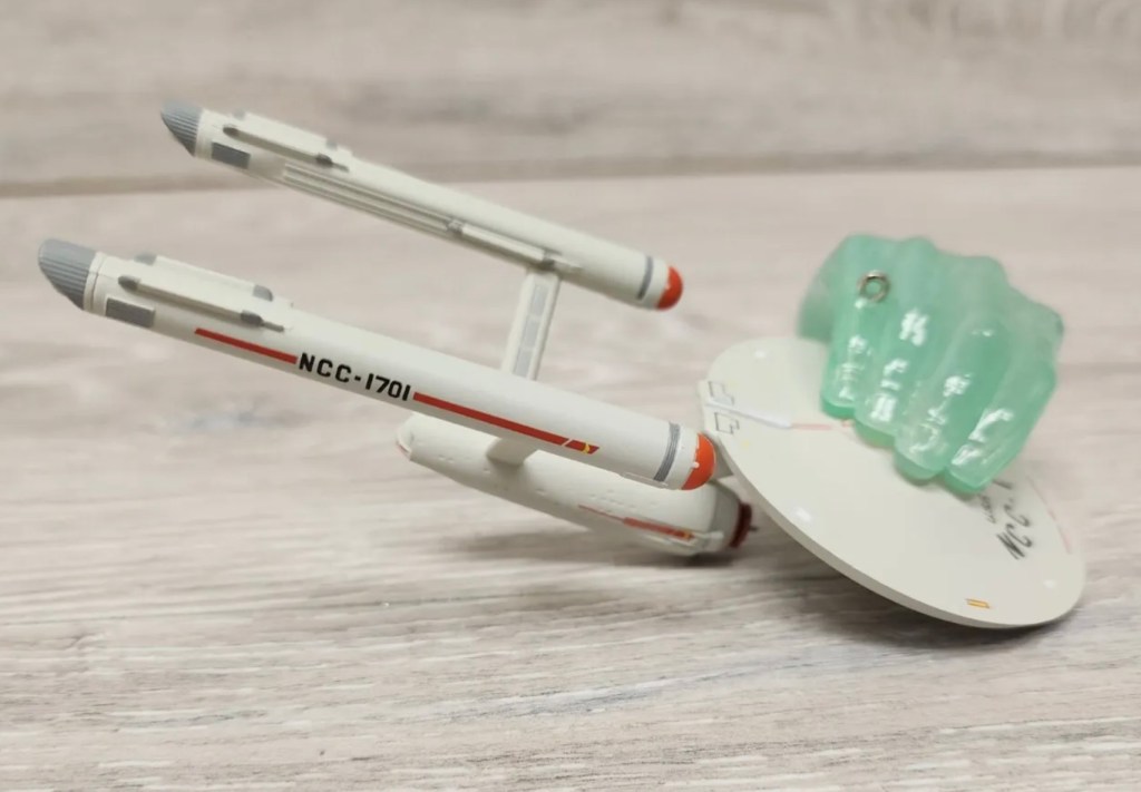 This ornament depicts the iconic opening scene from original Star Trek series episode “Who Mourns for Adonais?” first aired in 1967. Near the planet Pollux III, the Enterprise was held dead in space by a massive energy field shaped as a human hand. It belonged to a being claiming to be the Greek god Apollo.