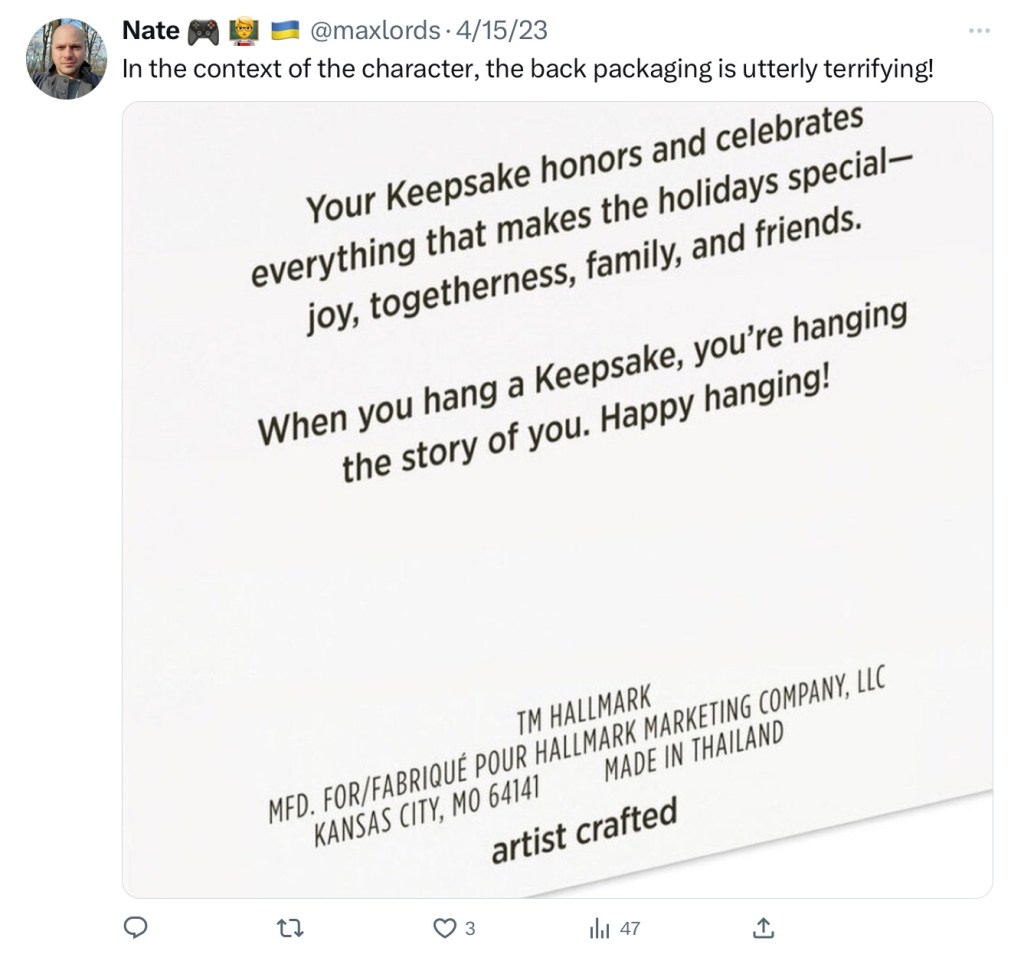 MFD. FOR/FABRIQUÉ POUR HALLMARK MARKETING COMPANY, LLC KANSAS CITY, ΜΟ 64141 MADE IN THAILAND