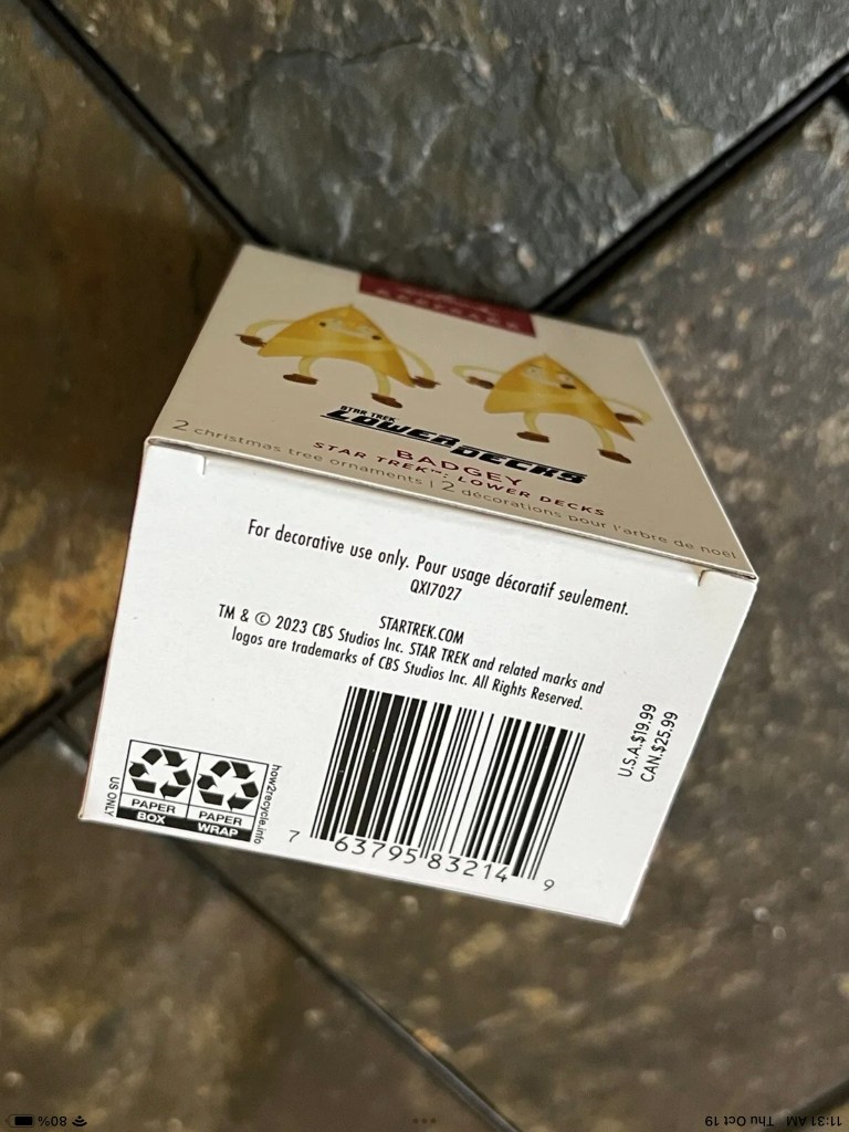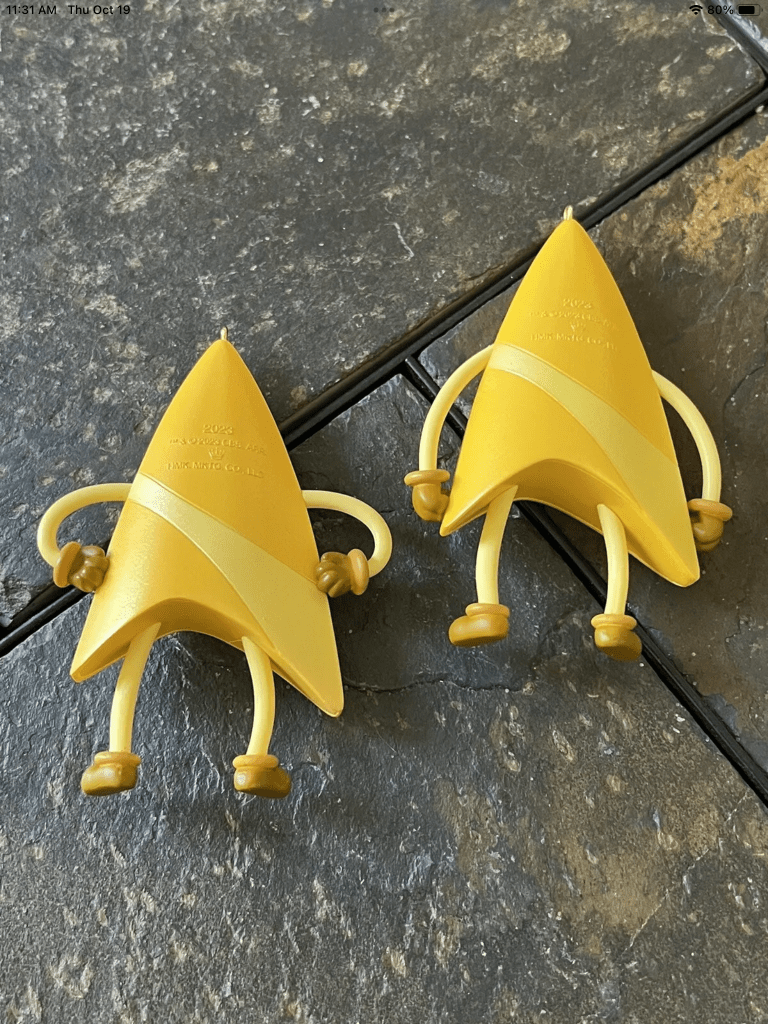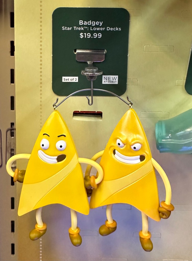 “Can I teach you a lesson?” If you hear that from Badgey, the malfunctioning tutor hologram onboard the “U.S.S. Cerritos,” prepare to learn about matters of life or death! This set of two Christmas tree ornaments shows the mascot of the Rutherford Training Beta 2.5 program in his Nice as well as Naughty personas as seen on “Star Trek: Lower Decks.”