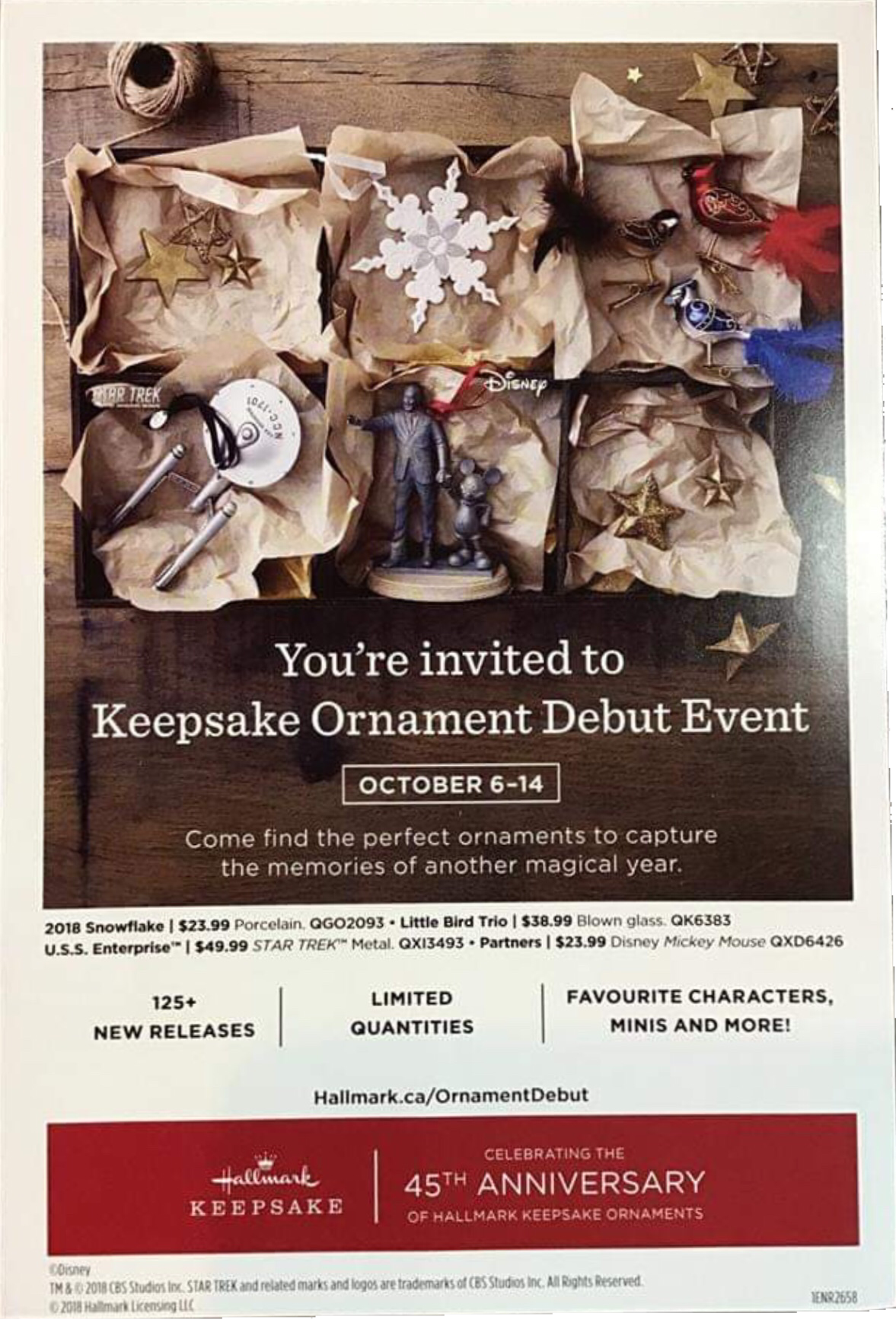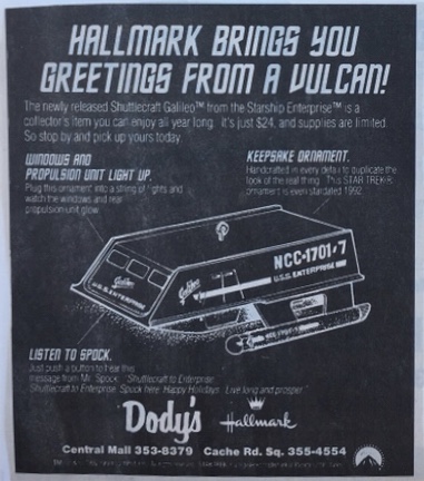 Unfortunately, the image is too blurry to make out the details but it is a Rowe-Manse Emporium and Country Store advertisement offering a buy back program of the 1991 Hallmark Enterprise ornament. As the ad shows, Rowe-Manse was offering $150 for Hallmark’s first Star Trek ornament. $150 in 1994 is equivalent to $268.50 in 2021. The ‘91 Enterprise is currently available on eBay for $75 and up. Originally sold for $20, the Enterprise was a huge success and supply did not keep up with the high demand.