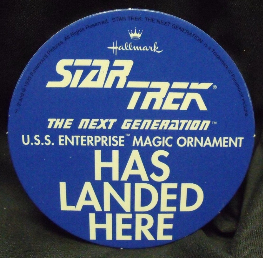 Hallmark spread the word of the release of The Next Generation’s Enterprise NCC-1701-D ornament in 1993 with a 3.25″ promotional button. A similar promotional button for another Enterprise ornament was distributed earlier this year.