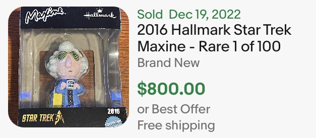 It was December of ‘22 when we last had a Maxine ornament listed on eBay. It had an initial asking price of $1,200 and eventually sold for $800. A new listing has arrived with an asking starting bid of $2,000 or Best Offer. eBay item number:155911096506