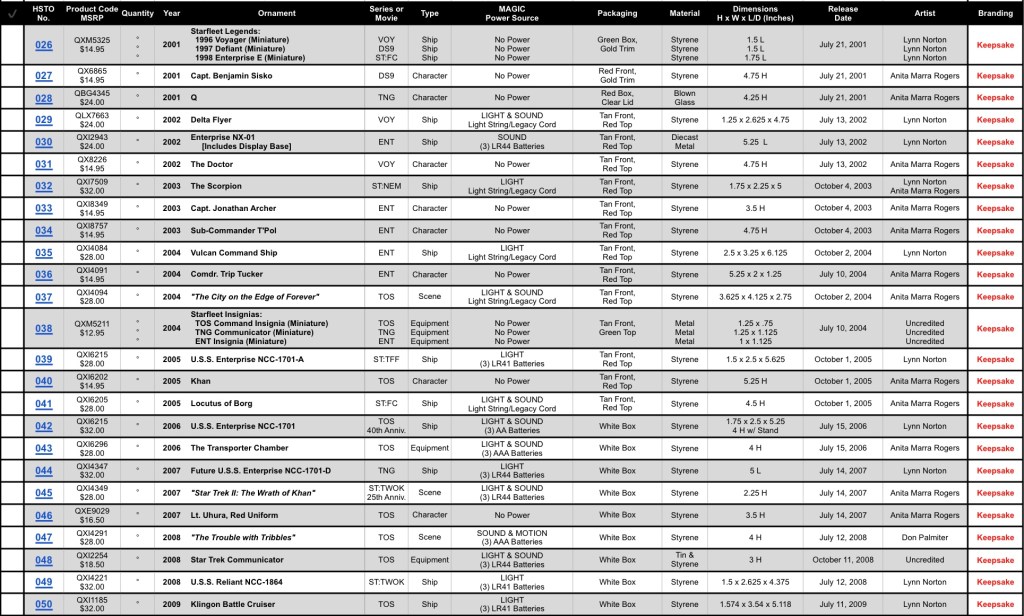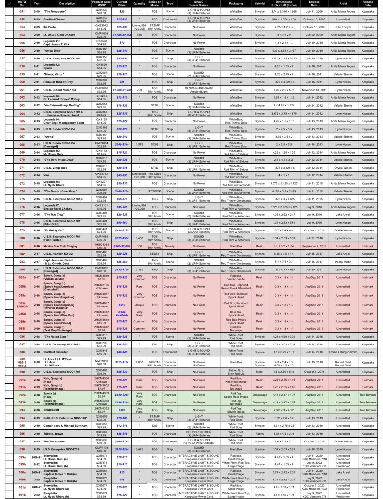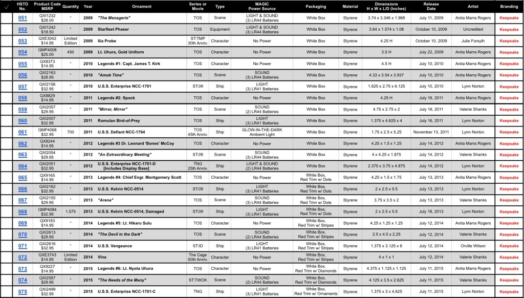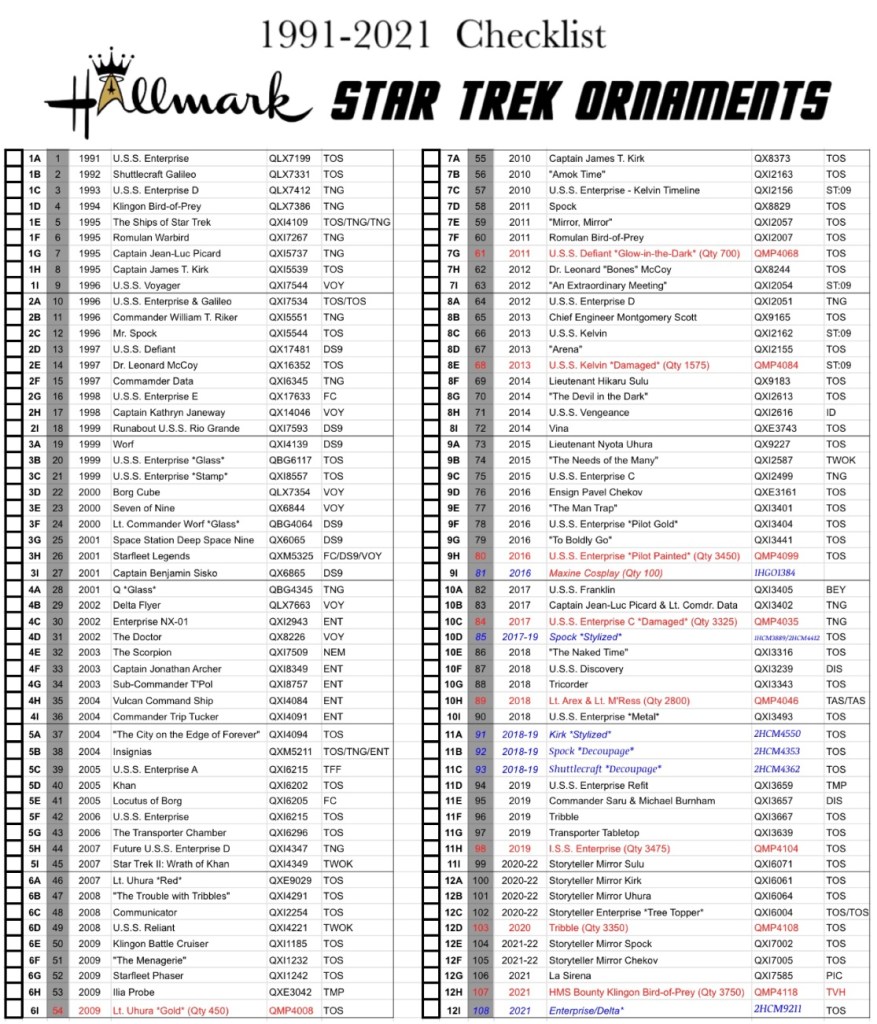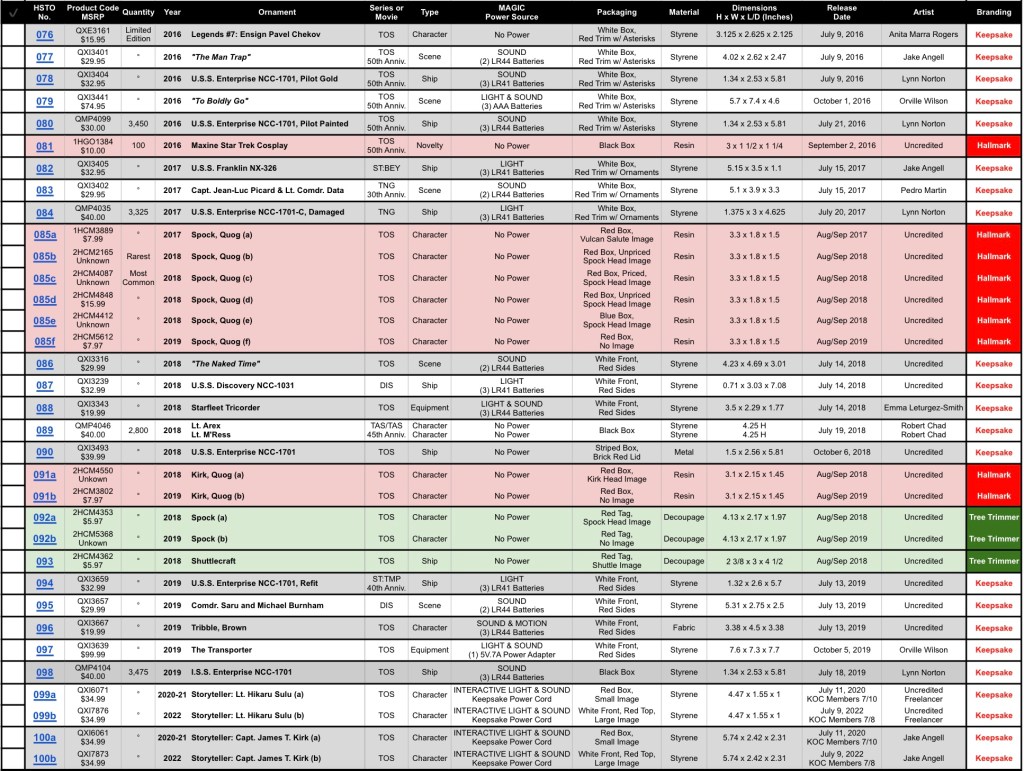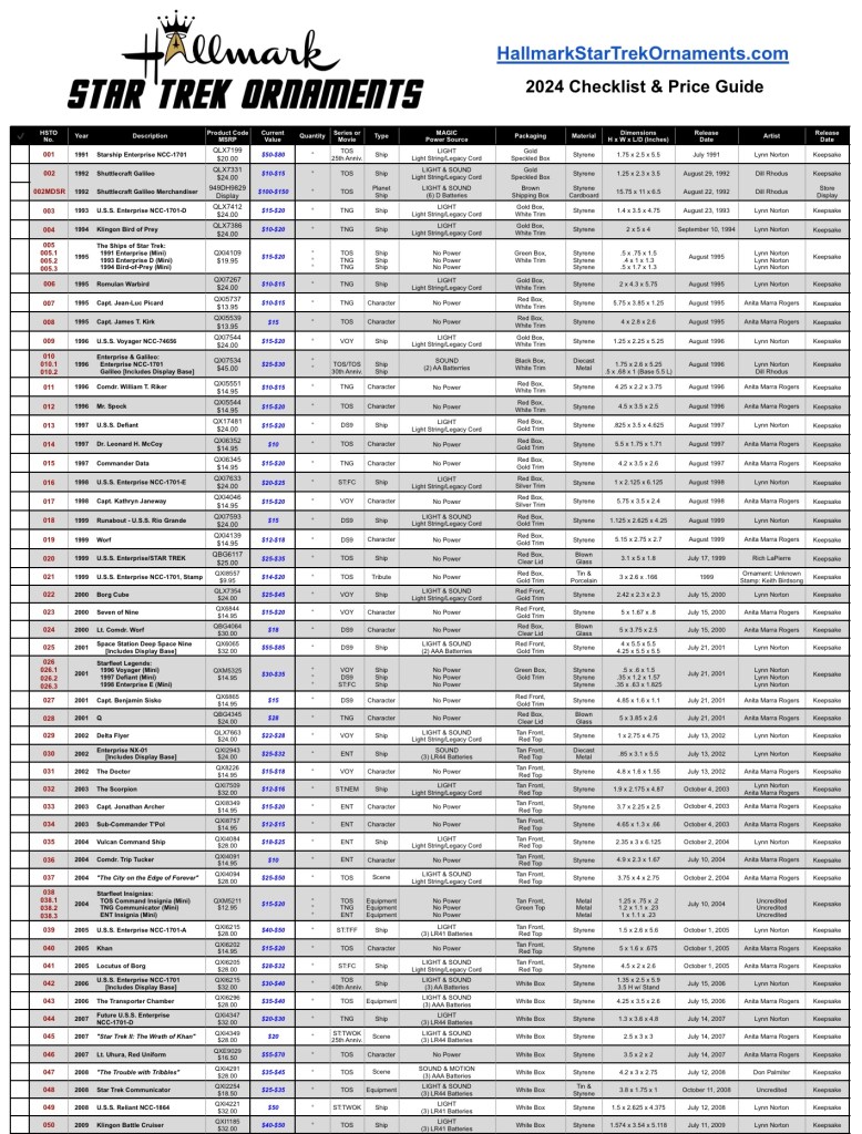 Updated checklist includes ornament descriptions, release years, limited quantities, series or movie attributions, anniversaries, features, power sources, release dates, artist credits, dimensions, MSRPs, model numbers, packaging, branding, hyperlinks and images for every Hallmark Star Trek Ornament!