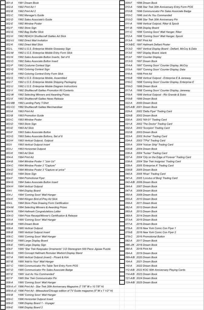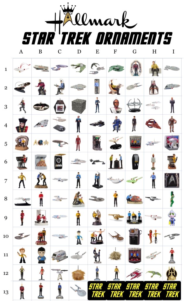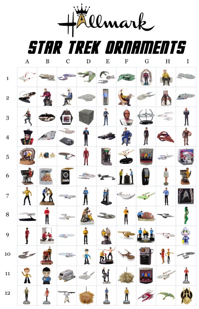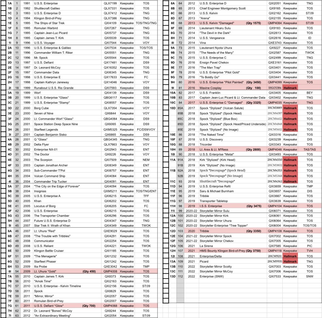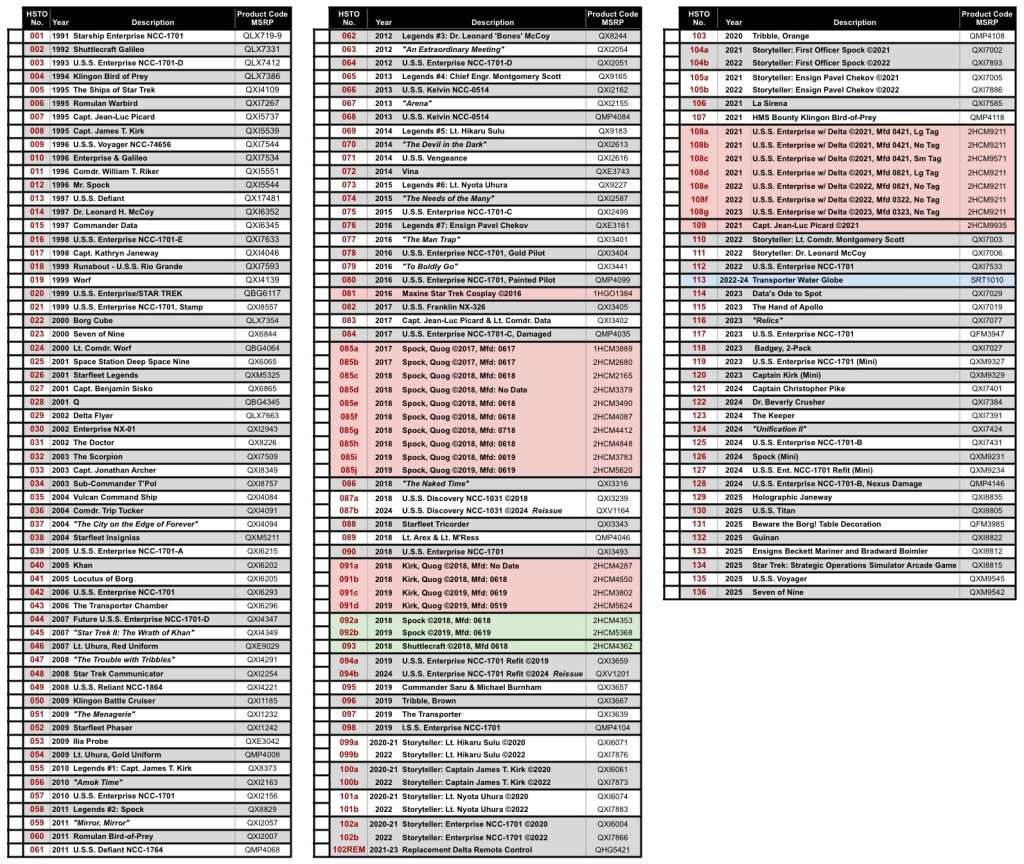 Updated checklist includes ornament descriptions, release years, limited quantities, series or movie attributions, anniversaries, features, power sources, release dates, artist credits, dimensions, MSRPs, model numbers, packaging, branding, hyperlinks and images for every Hallmark Star Trek Ornament!