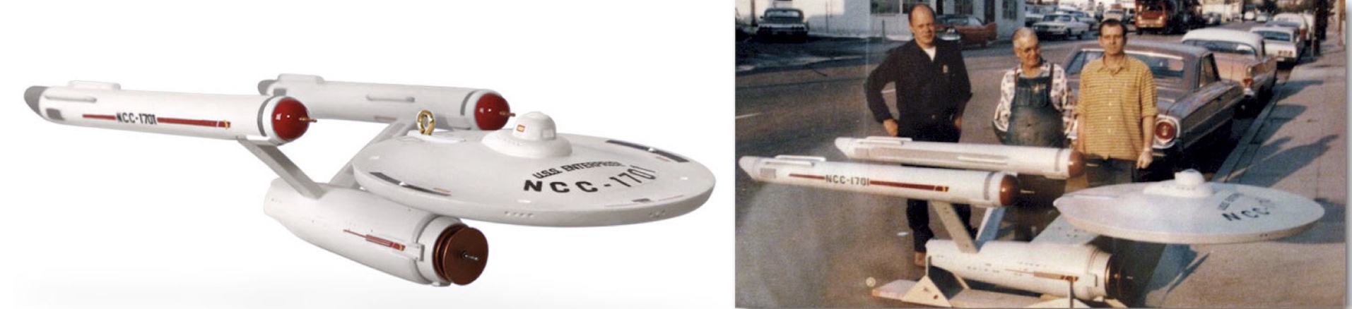 Lynn Norton: ”From the beginning, Star Trek imagined that we had overcome the problem of a ship having enough energy not only to propel yourself but to give yourself a comfortable living environment. As a design, it captured our excitement from the notion of flying saucer and the way we had come to imagine what a deep-space vehicle might look like. When you start thinking of the physics of propelling an object through space, it doesn’t have to look aerodynamic. It can be purely functional. The fact that it was a flying saucer is one of the things that captured my imagination right away. All space movies are really submarine movies. The Enterprise reflects all the elements of a submarine crew’s experience — living in close quarters in a hostile environment with nothing but a thin metal skin between them and oblivion — and put it in space seamlessly. At Hallmark, Don Palmiter, Dill Rhodus and I brought fine scale model-making to the ornament business. We really had to convince our art directors we could go beyond cute and traditional and make really believable small models to be used as ornaments. Our commitment to high quality fit right into the Hallmark ideals for product. Now, I also had to fight the initial idea of having a string of garland hanging along the edge of the primary hull, and Santa Claus popping out of the bridge — true story! I wanted to make it as accurate as possible. I’m very aware of the changes to that first ornament. Because it had big, thick circuitry inside for lights, the ornament had heat dissipation problems. We had to build a big cavity into it so the circuit board would not melt the plastic. Also, the ornament had to fit into a ‘printer’s box’ store display with a limited space, and I had to shorten the nacelles for it to fit. I beat that poor design nearly to death, but it got us started and it was very popular with fans of Star Trek and of Keepsake Ornaments. When we reissued the ornament in 1996 for the show’s 30th anniversary, we used the same design.”