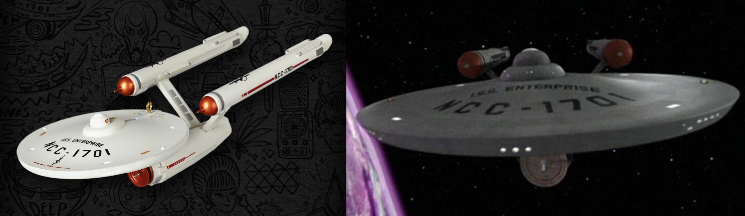 Box text: The flagship of Starfleet, U.S.S. Enterprise NCC-1701 embarked on its historic five-year mission under Captain James T. Kirk in 2265. The ship and crew introduced Star Trek™ viewers to the final frontier with unparalleled adventure, life on new worlds and unimaginable technologies. An homage to the classic series and its legacy of more than 50 years, this premium Christmas tree ornament is rendered in metal, an essential addition to any Star Trek™ collection.