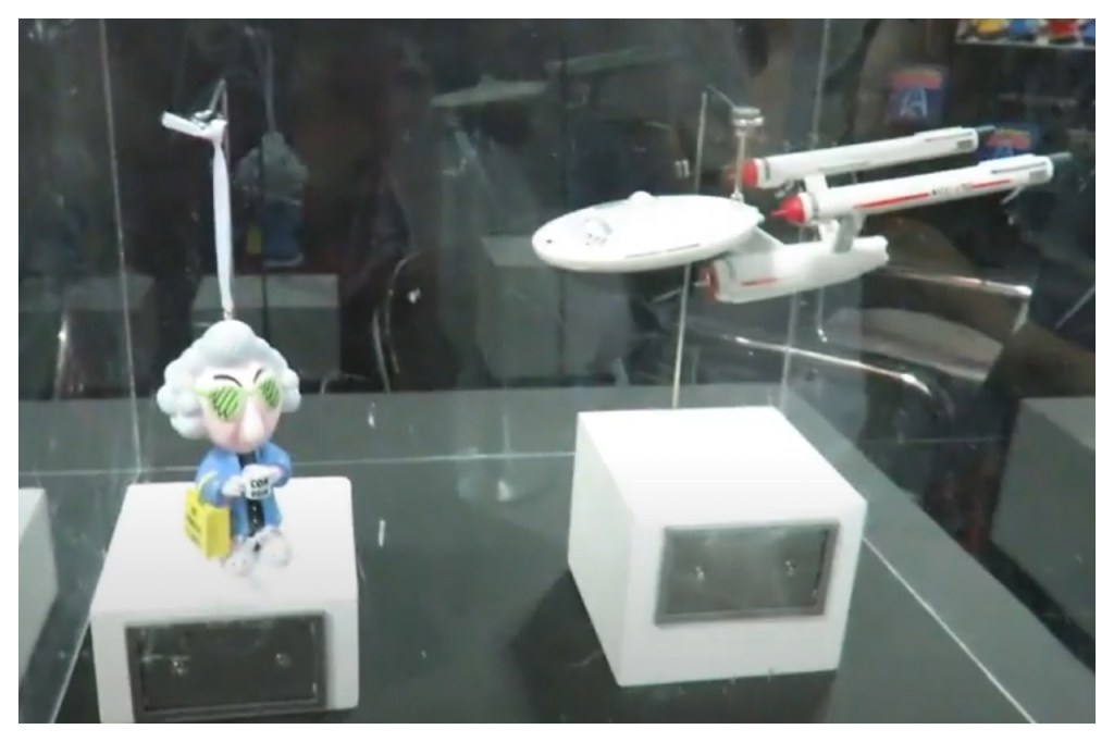 The gallery, in the form of a transporter chamber, stood beside Hallmark’s event booth. It was comprised of seven tall, vertical windows each holding a dozen or so ornaments.