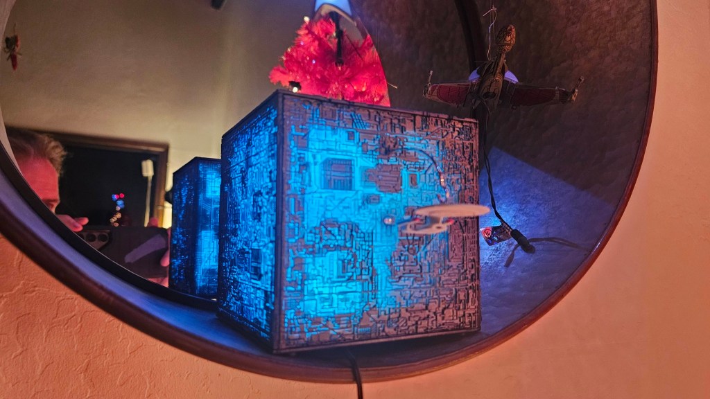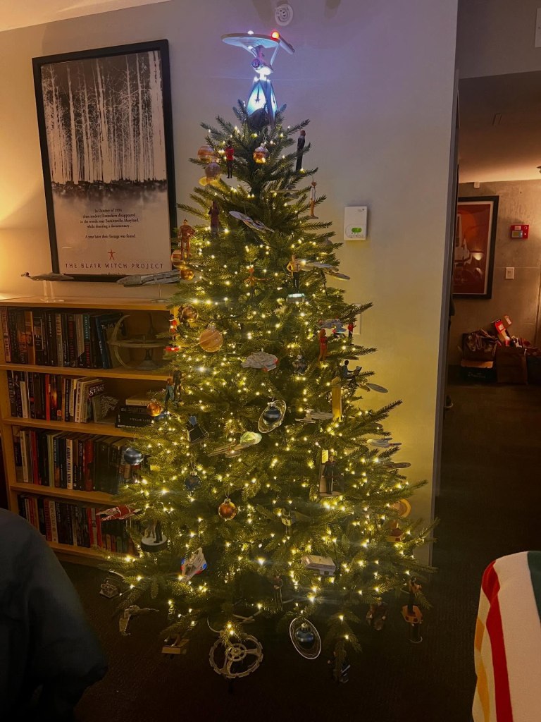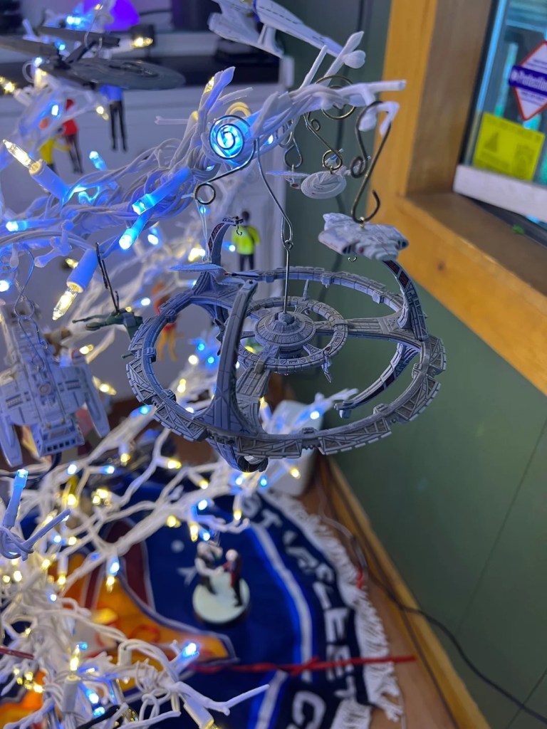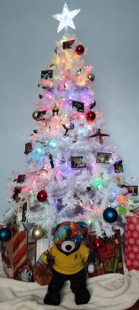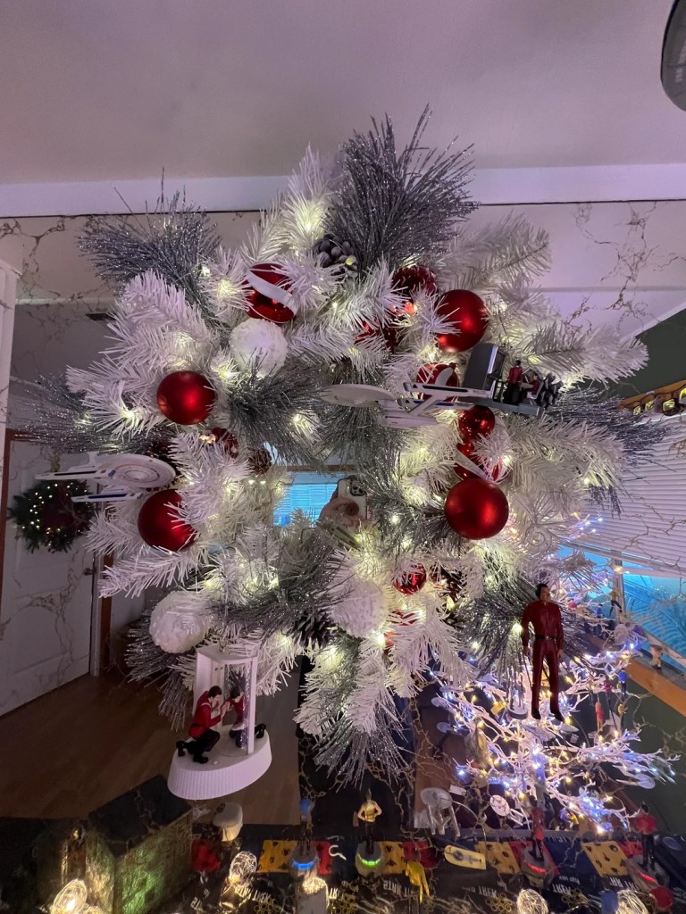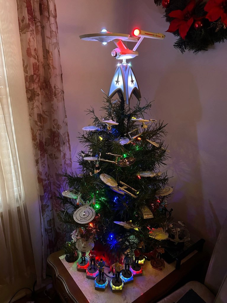 We’ve had a Star Trek / sci-fi holiday tree for a number of years and now we have another addition from a finally delivered birthday present (thanks, Andy! Now have powered it on and I’m ready to go to sleep: except I do have the entire Enterprise crew from two different series keeping watch so perhaps I won’t be assimilated … tonight –David Watson on Facebook
