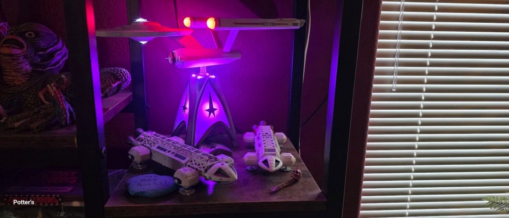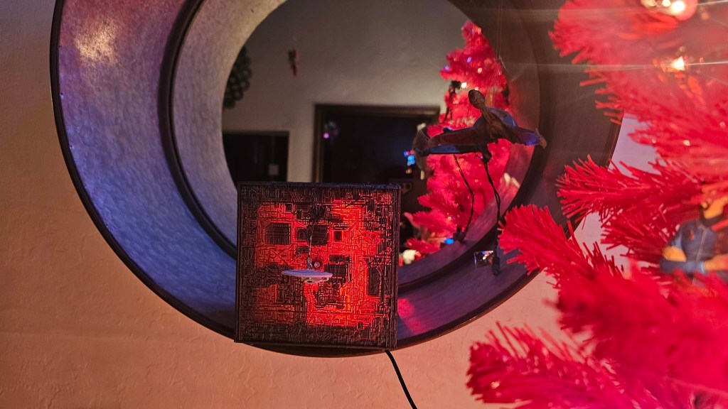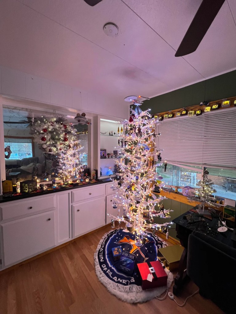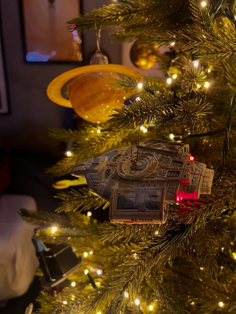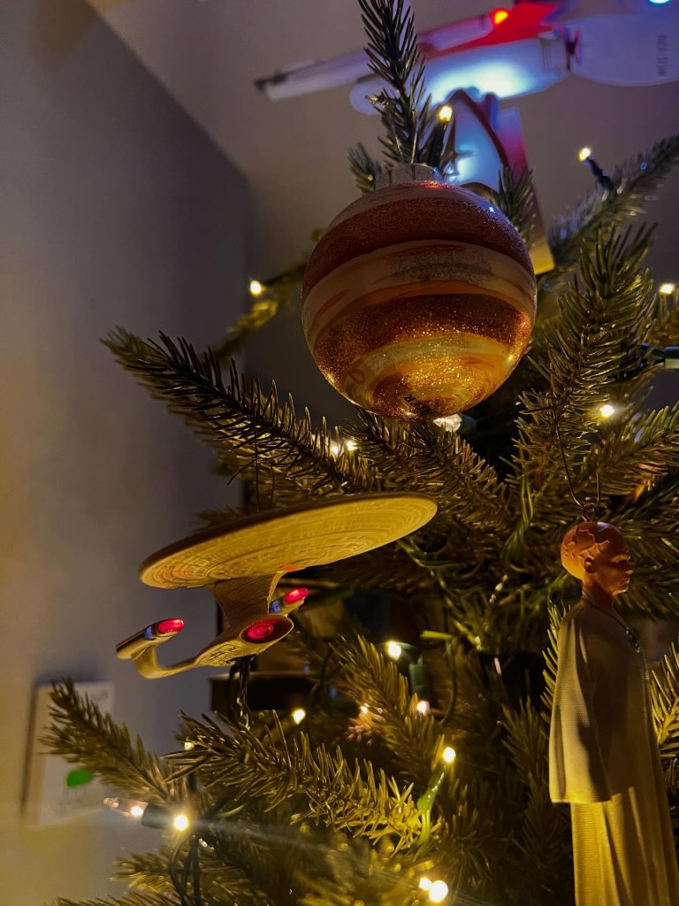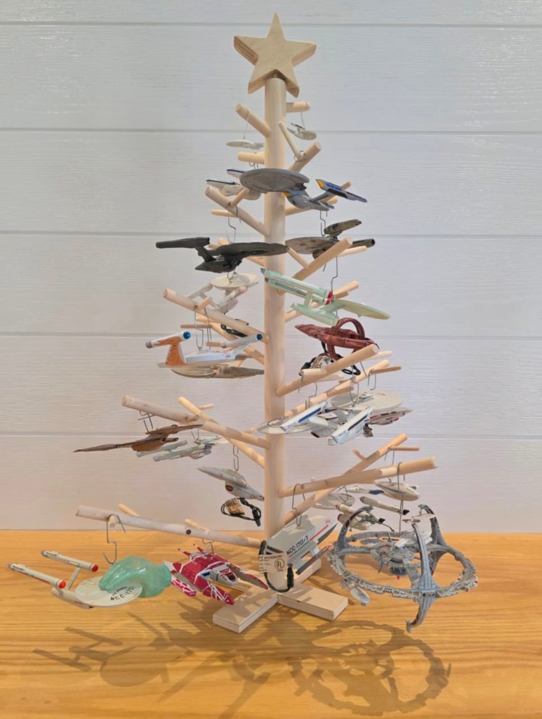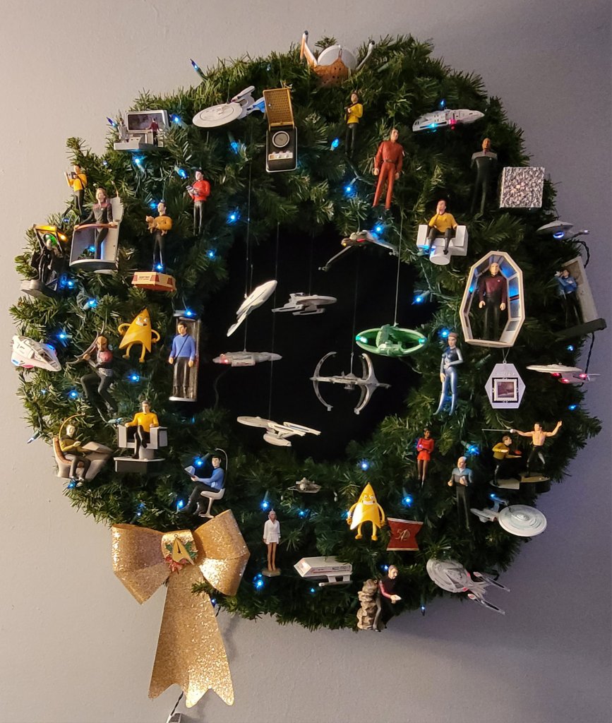 We’ve had a Star Trek / sci-fi holiday tree for a number of years and now we have another addition from a finally delivered birthday present (thanks, Andy! Now have powered it on and I’m ready to go to sleep: except I do have the entire Enterprise crew from two different series keeping watch so perhaps I won’t be assimilated … tonight –David Watson on Facebook