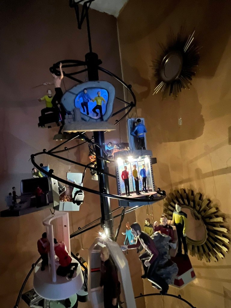Star Trek Christmas tree! Put together by my buddy. It includes set pieces from Tribbles and The Cage, as well as Kirk, Spock and McCoy in the Transporter room. Each, along with the scale model Enterprise down front, features quotes, sound effects and lighting from the original series. Picard and Janeway are in there as well. Live long and prosper, Santa! –Tom Smith on Facebook