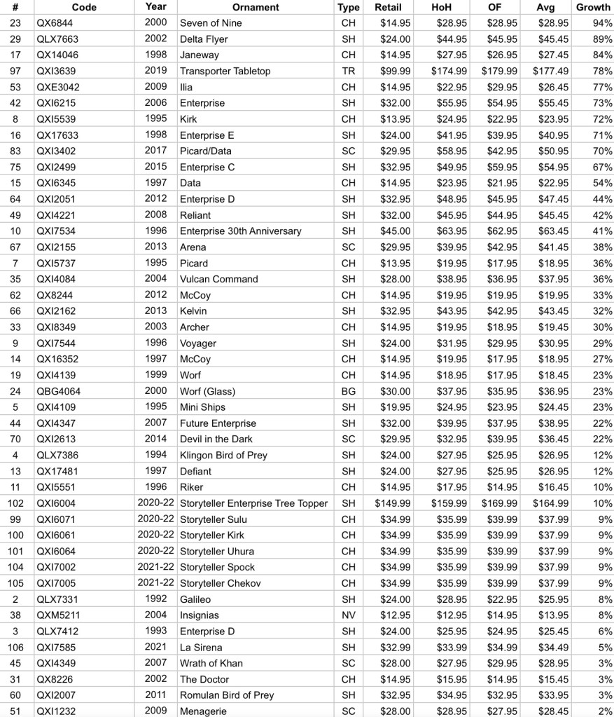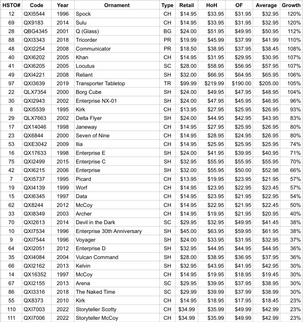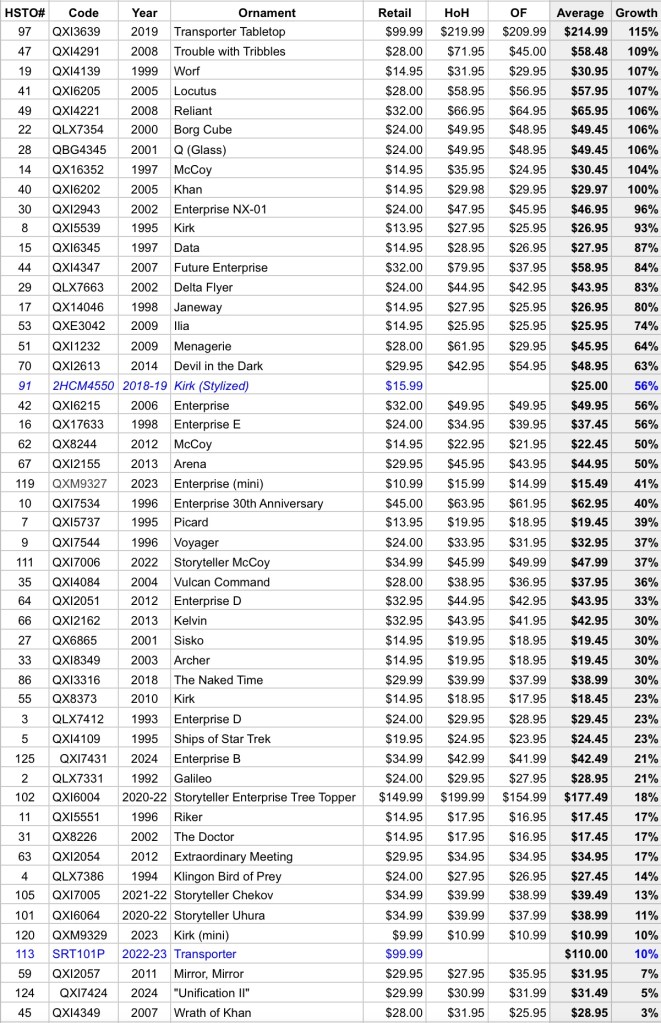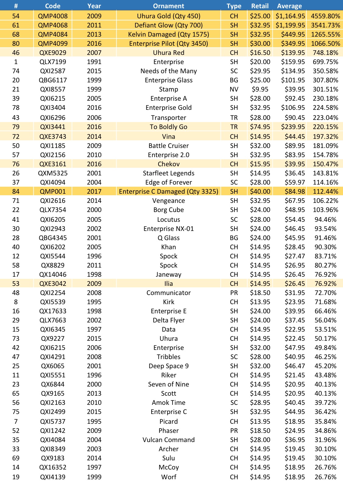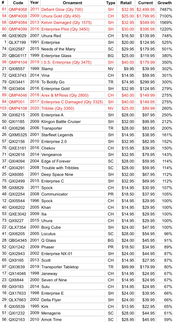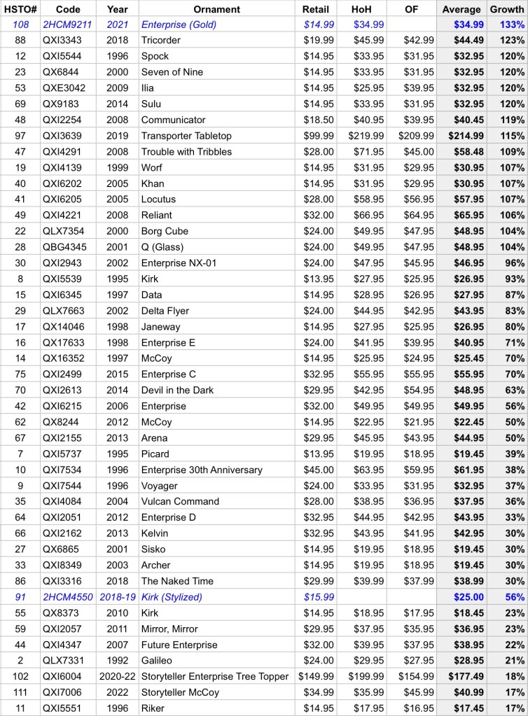 All in all, 14 Star Trek ornaments have more than doubled in price but buyer beware, there are some proven duds out there. One doesn’t have to look further than 2007’s Trip Tucker of Enterprise fame which can’t fetch even half of its original cost. Sorry Trip.