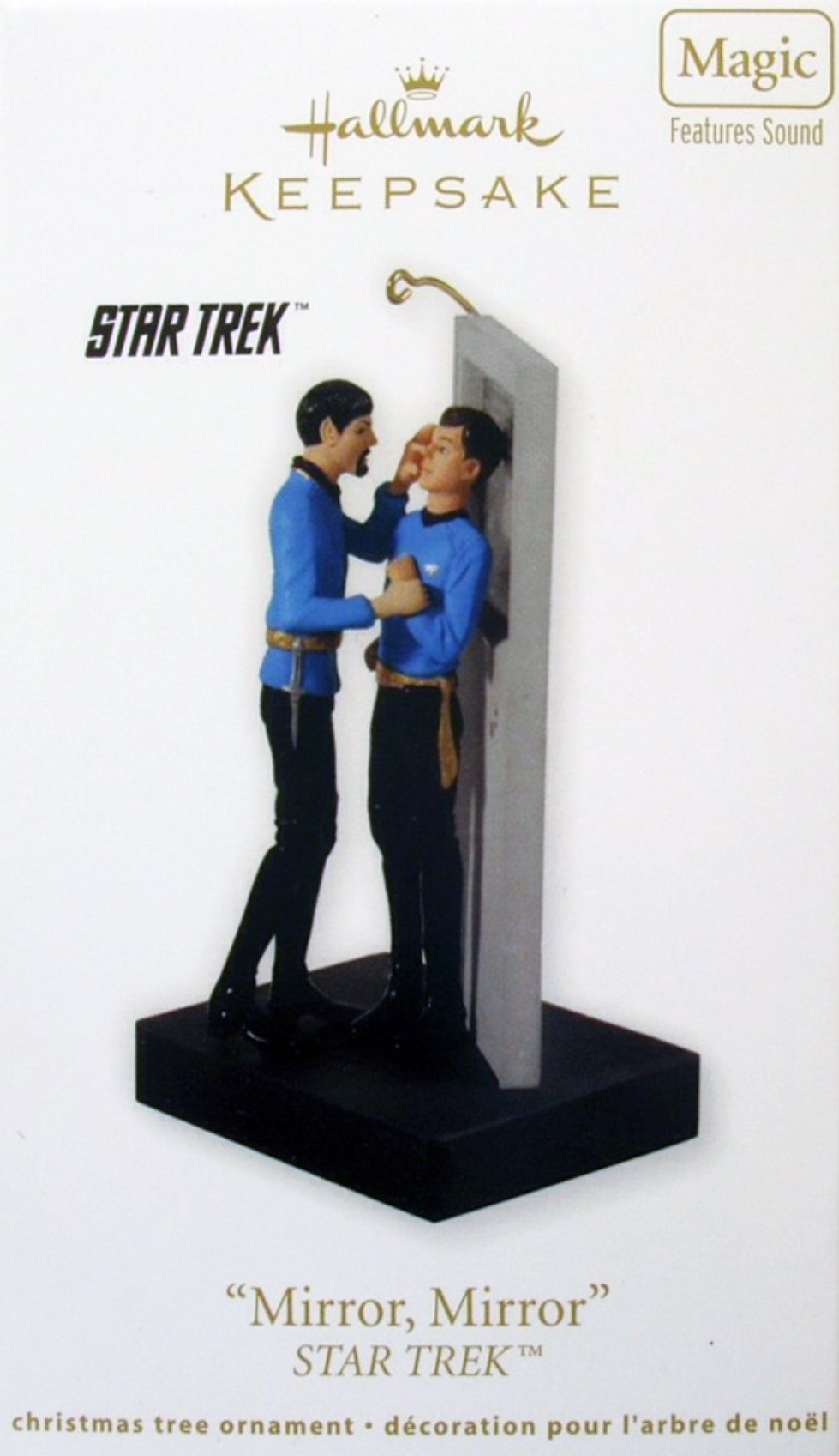 Box Text: In “Mirror, Mirror” (1967), a transporter mix-up switches Captain kirk, Dr. McCoy, Scotty, and Lt. Uhura with their “evil twins” from a “Mirror Universe.” The crew members masquerade as their ruthless couterparts on the barbaric I.S.S. Enterprise until they make it back home with the assistance of a surprising ally, “Mirror Spock.” After discovering the switch through a mind-meld with McCoy, Spock helps put the alternate universes and their inhabitants back into logical order.