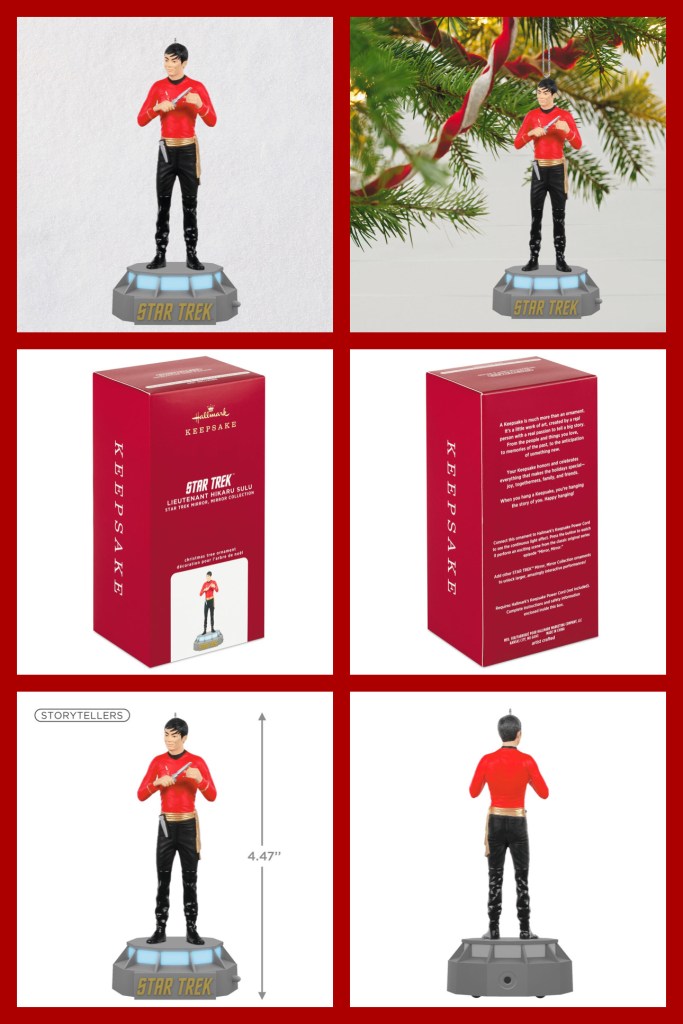One of the most menacing characters aboard the I.S.S. Enterprise, Lieutenant Sulu watches over the starship’s crew. Featuring Sulu dressed in his Terran Empire uniform, this Christmas tree ornament captures the cunning security chief of the Mirror Universe. Plug the ornament into Hallmark’s Keepsake Power Cord (sold separately) for constant illumination, then press the button to start a sound and light show based on the classic original Star Trek series episode “Mirror, Mirror.” Connect all of the Star Trek Storytellers ornaments—Captain James T. Kirk, Lieutenant Hikaru Sulu and Lieutenant Nyota Uhura—and the U.S.S. Enterprise Tree Topper (each sold separately) to unlock additional interactive performances.