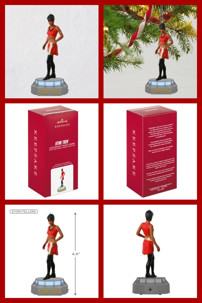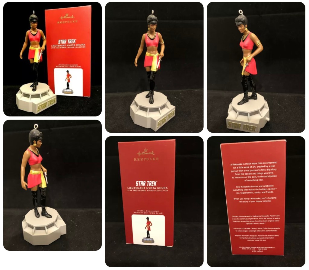 Trapped in an angry universe not her own, Lieutenant Uhura tries her best to disguise from the I.S.S. Enterprise crew that she does not belong—unlike this Christmas ornament that certainly belongs on your tree. Plug the ornament into Hallmark’s Keepsake Power Cord (sold separately) for constant illumination, then press the button to start a sound and light show based on the classic original Star Trek series episode “Mirror, Mirror.” Connect all of the Star Trek Storytellers ornaments—Captain James T. Kirk, Lieutenant Hikaru Sulu and Lieutenant Nyota Uhura—and the U.S.S. Enterprise Tree Topper (each sold separately) to unlock additional interactive performances.